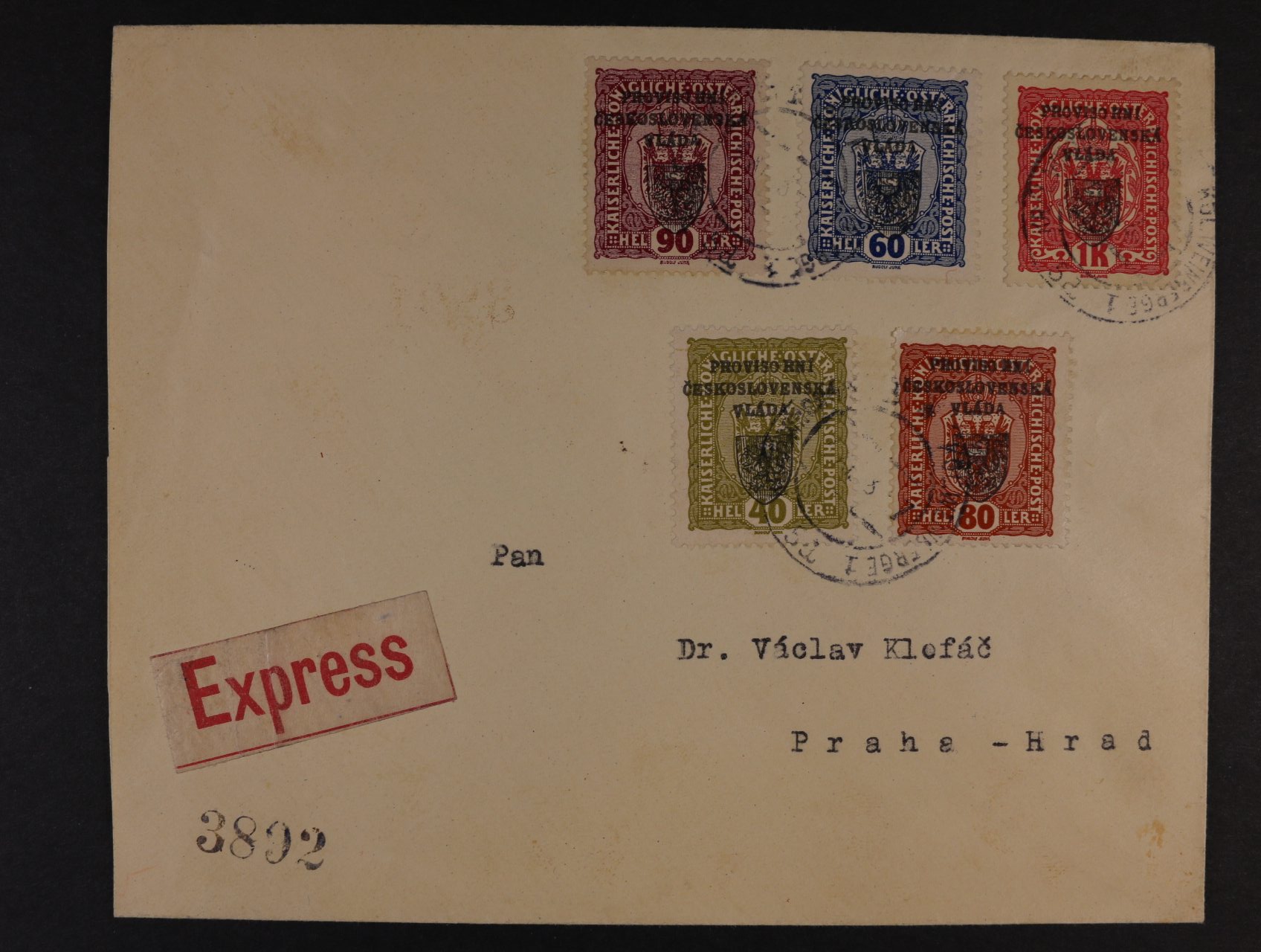 EXPRES dopis v místě frank. zn. RV č. 10, RV 12 - RV 15, pod. raz. KRÁLOVSKÉ VINOHRADY