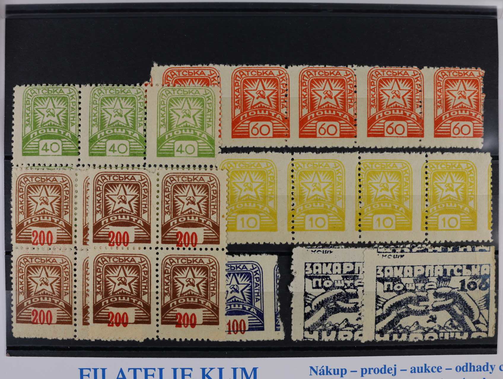 sestava známek prvního a druhého definitívního vydání NRZU - zn. kat. Majer č. 2a (2x), č. 4 ve vodorovné čtyřpásce, č. 6b v 6ti-bloku, č. 7 v 5ti-pásce, č. 8, č. 9 ve čtyřbloku, č. 9b ve čtyřbloku, kat. Majer 14000 Kč