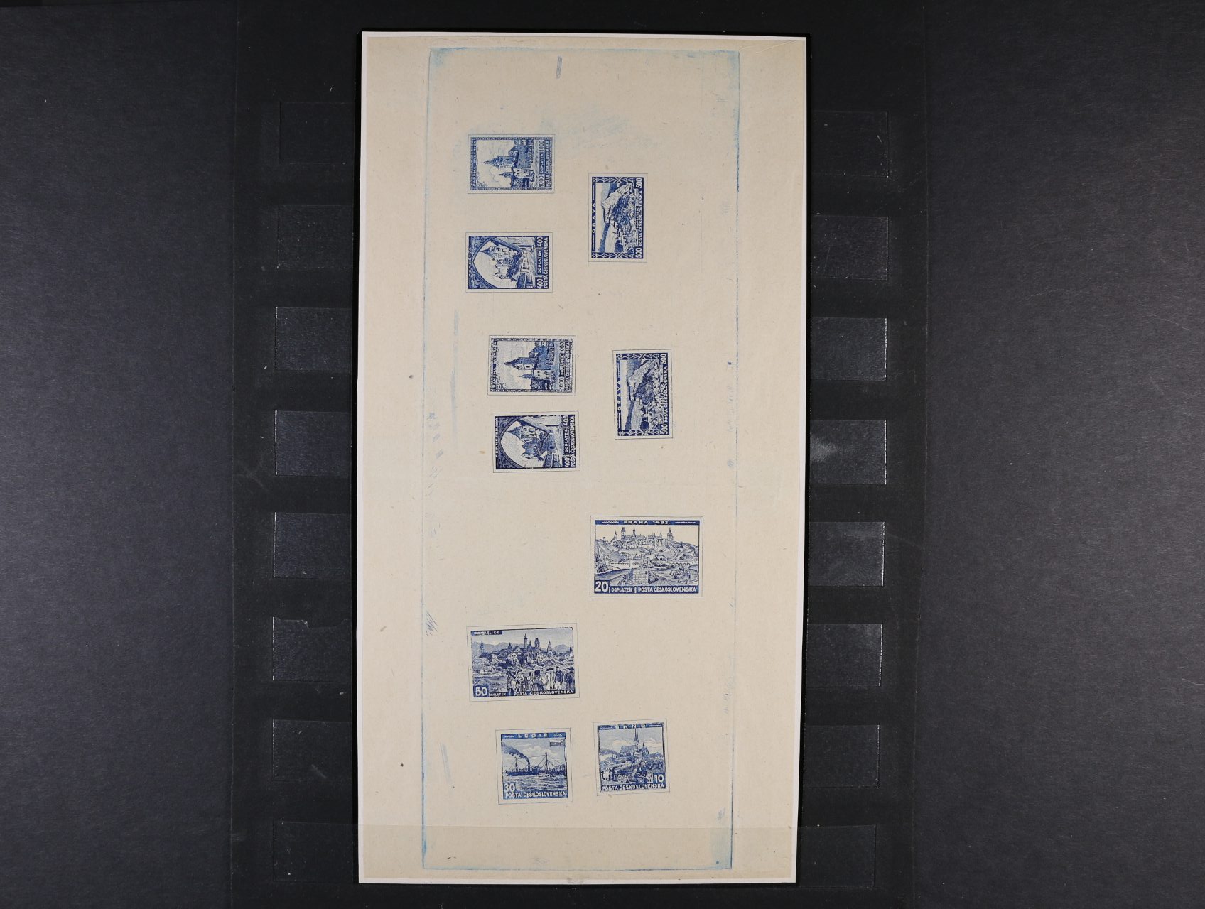 soutisk 10ti různých nepřijatých návrhů na známky v modré barvě na papíře bez lepu
