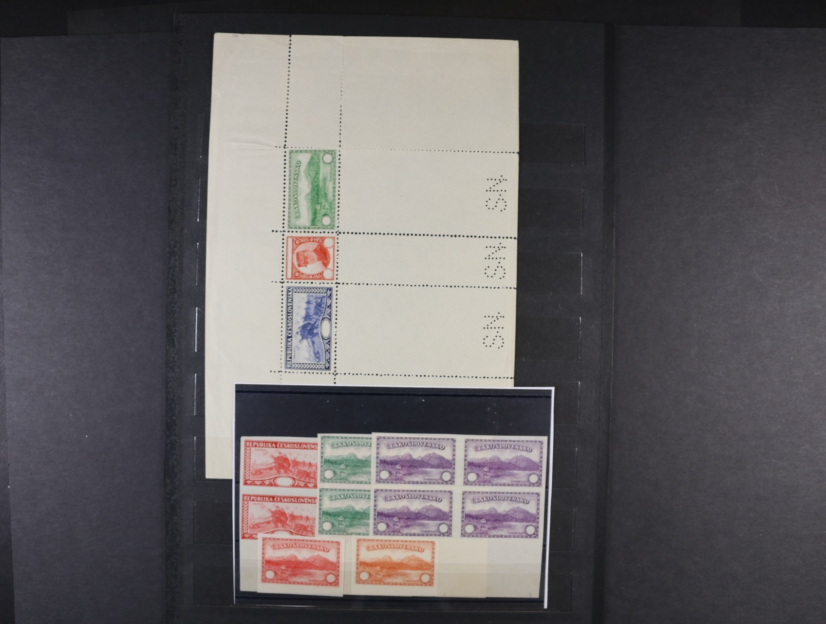 ZT nepřijatého návrhu na zn. Zborov, Štrbské pleso, v barvě červené, zelené a fialové ve čtyřblocích se spodním okrajem, navíc 1x soutisk v aršíkové úpravě s perforací a průpichem S.N. na spodním okraji známek, zajímavé