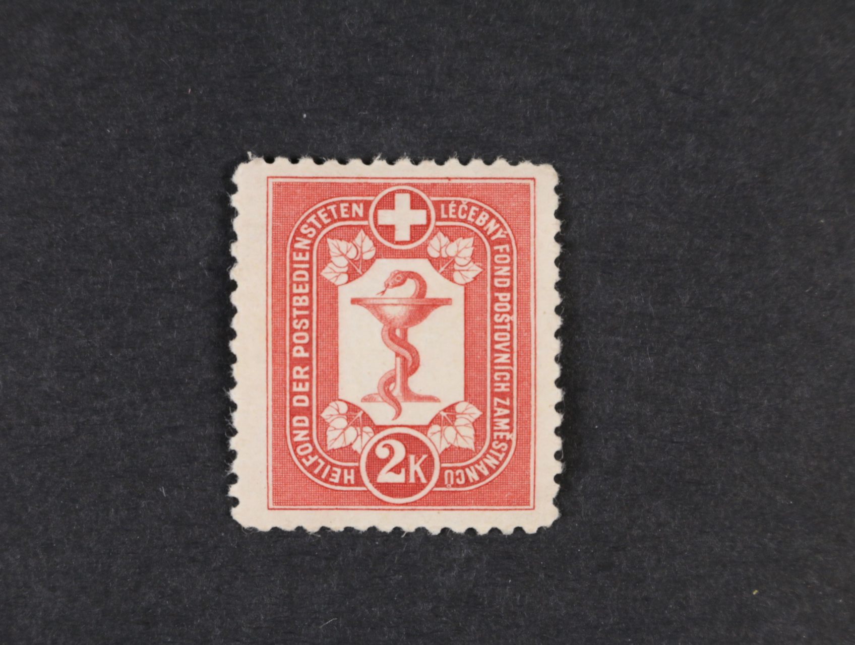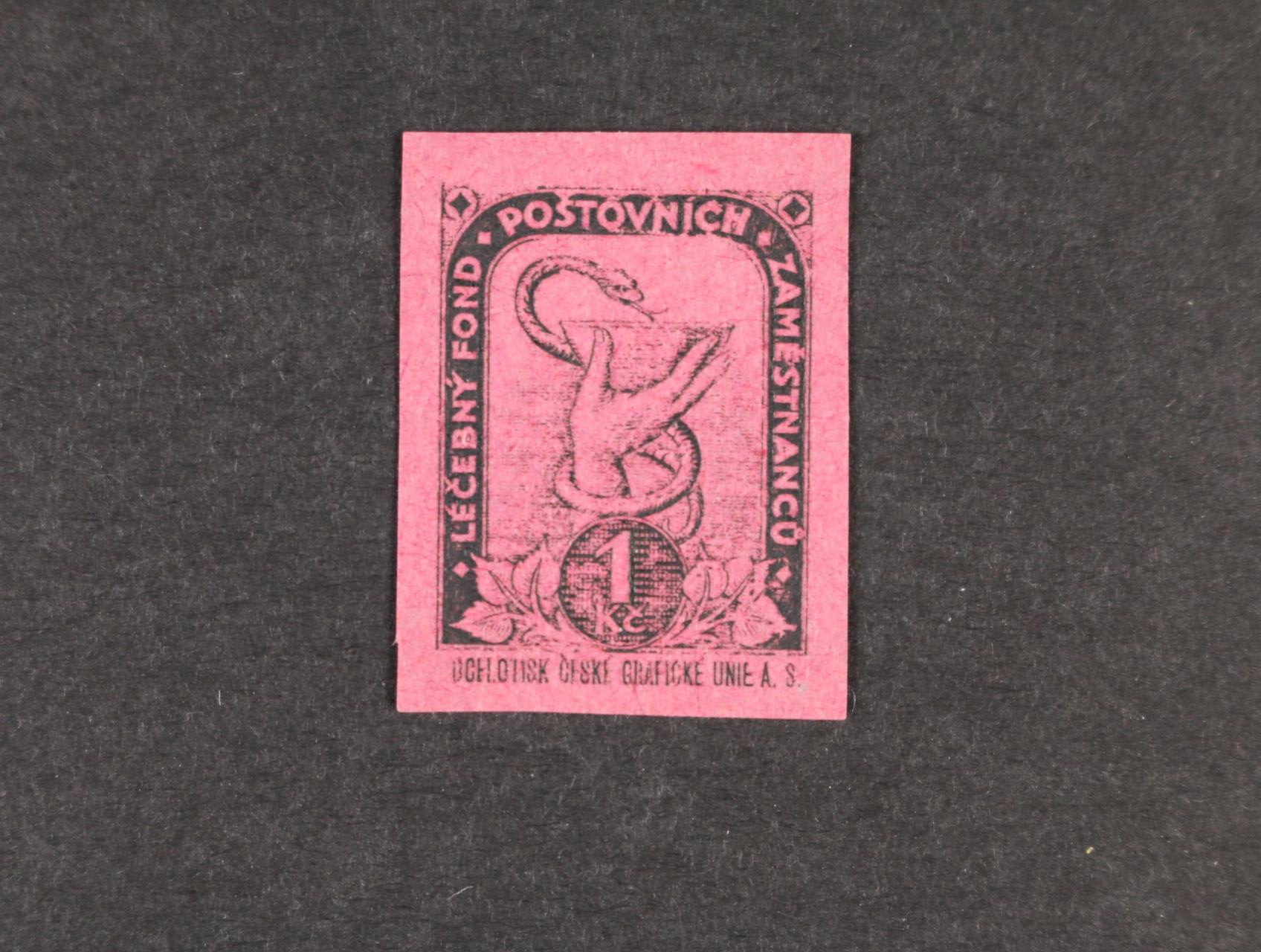 ZT zn. 1Kč LÉČEBNÝ FOND POŠTOVNÍCH ZAMĚSTNANCŮ v černé barvě na červeném papíře