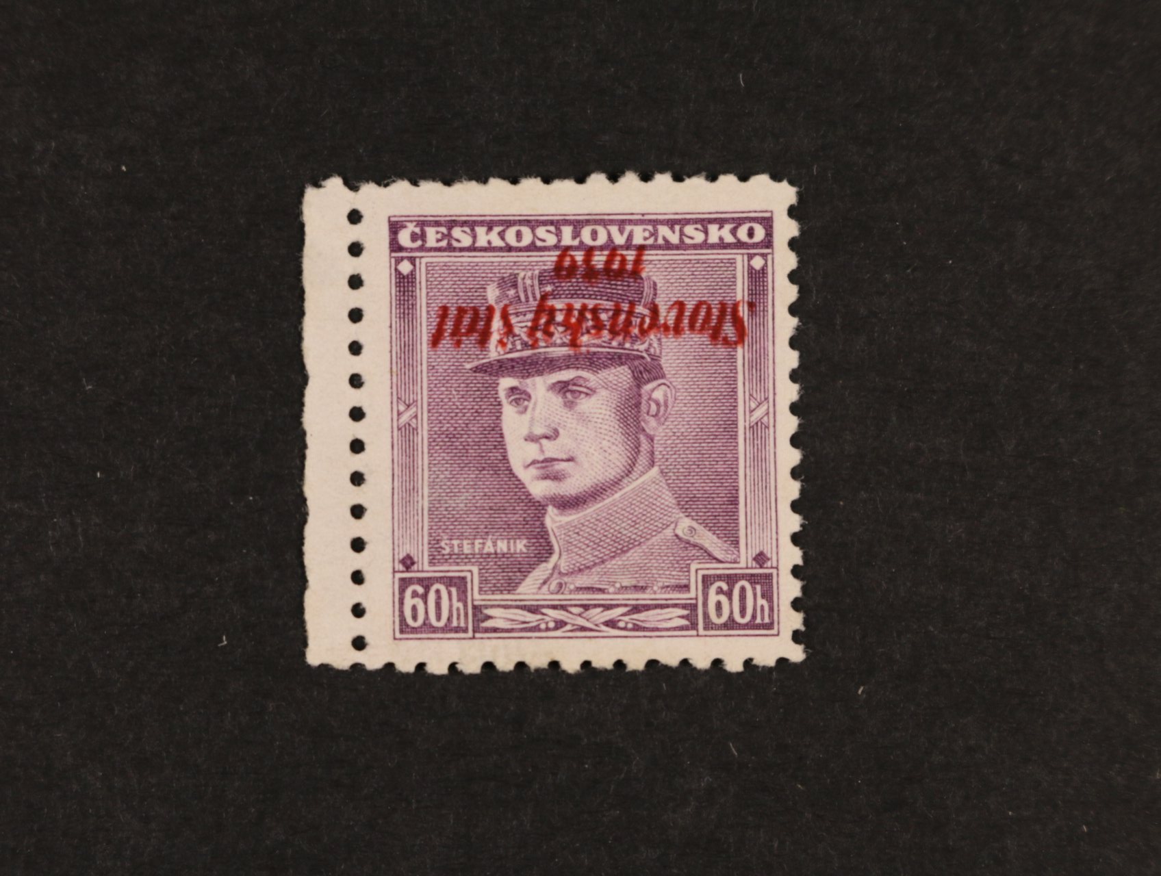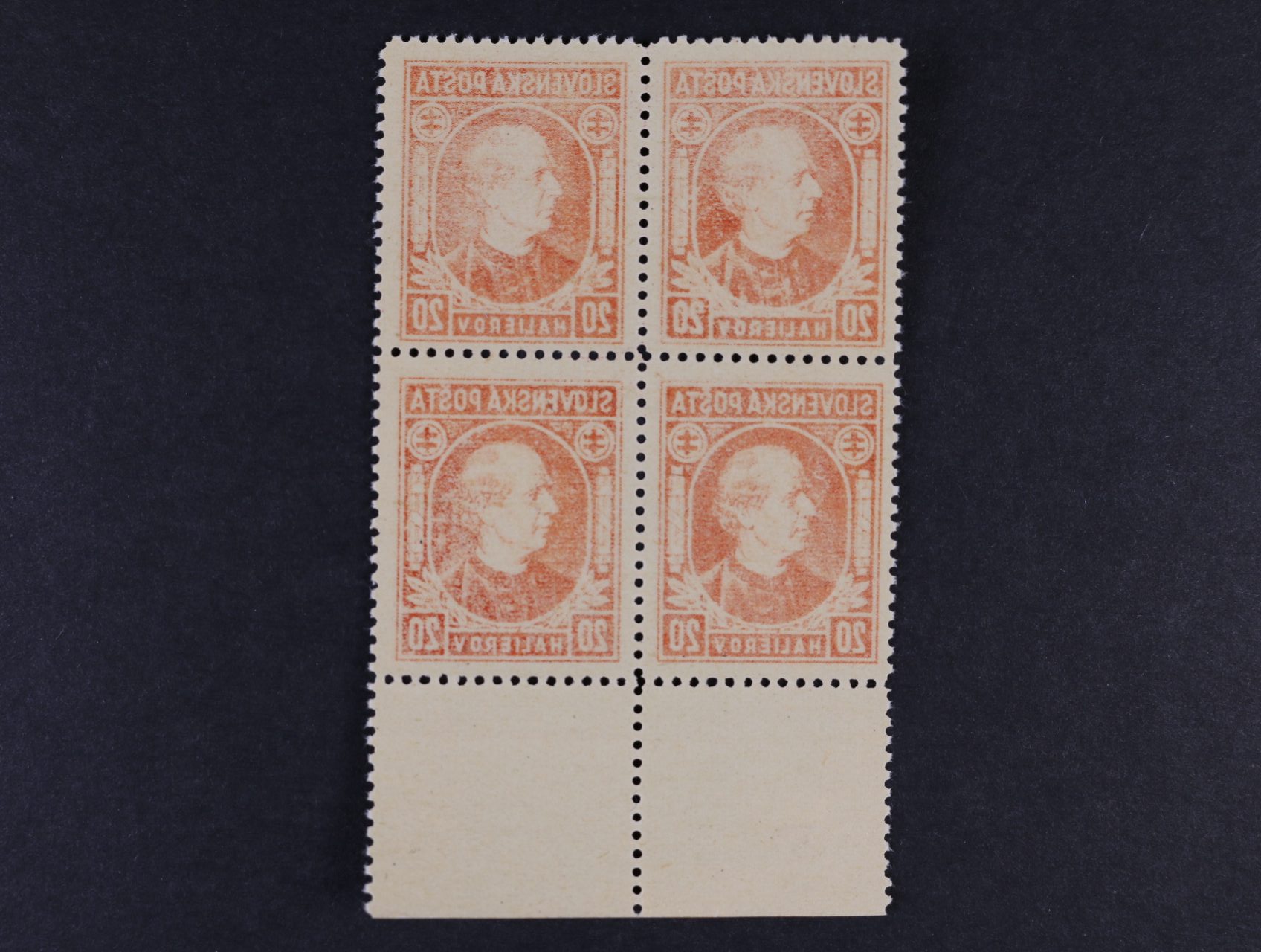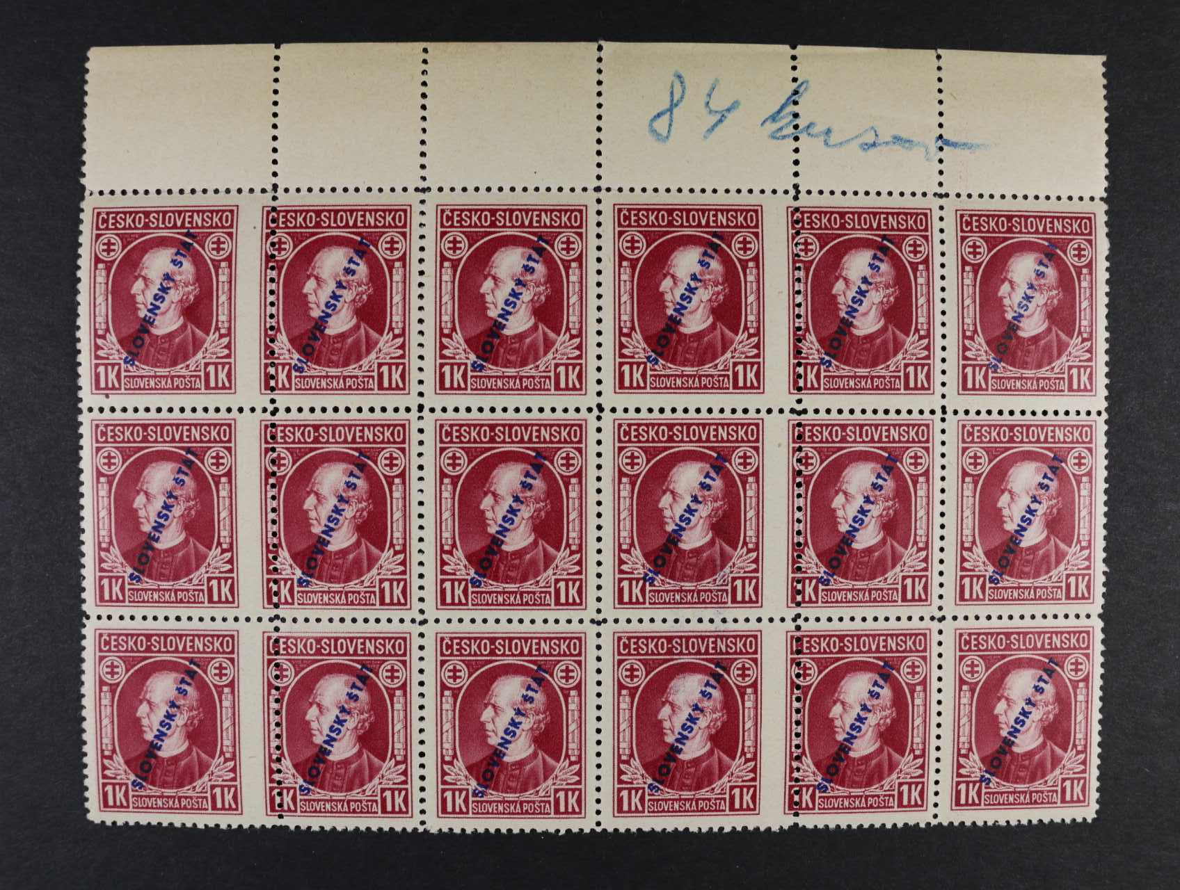 zn. č. 24 A v 18ti-bloku s hormím okrajem, v 2. a 5tém sloupci s posunem svislé perforace až do obrazu zn.