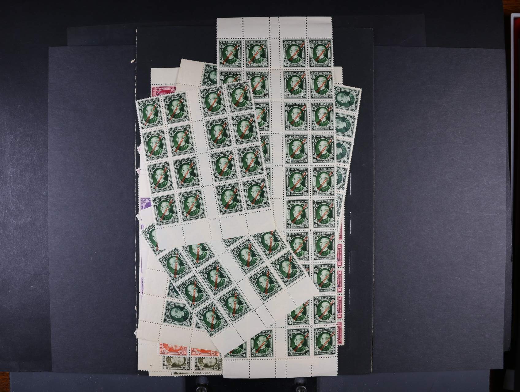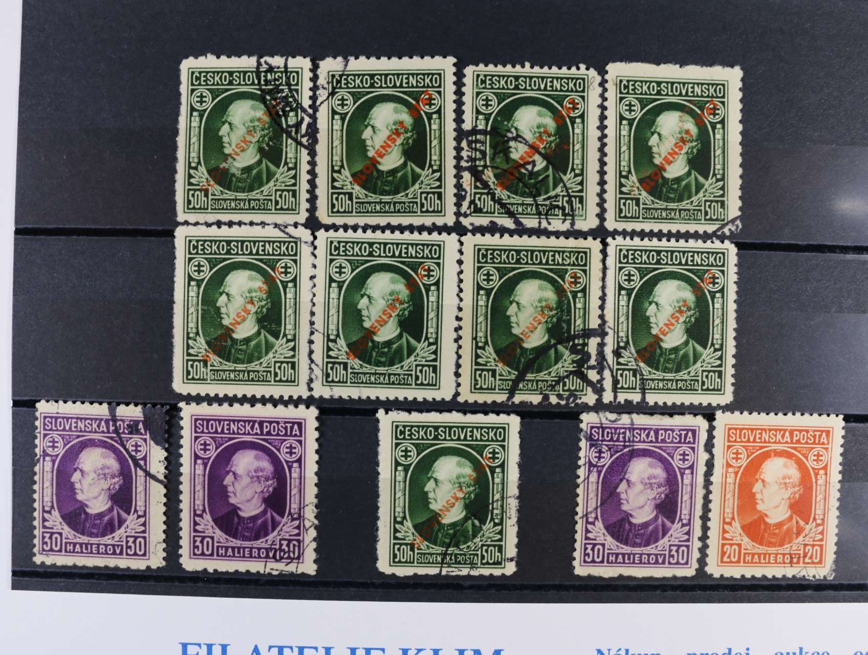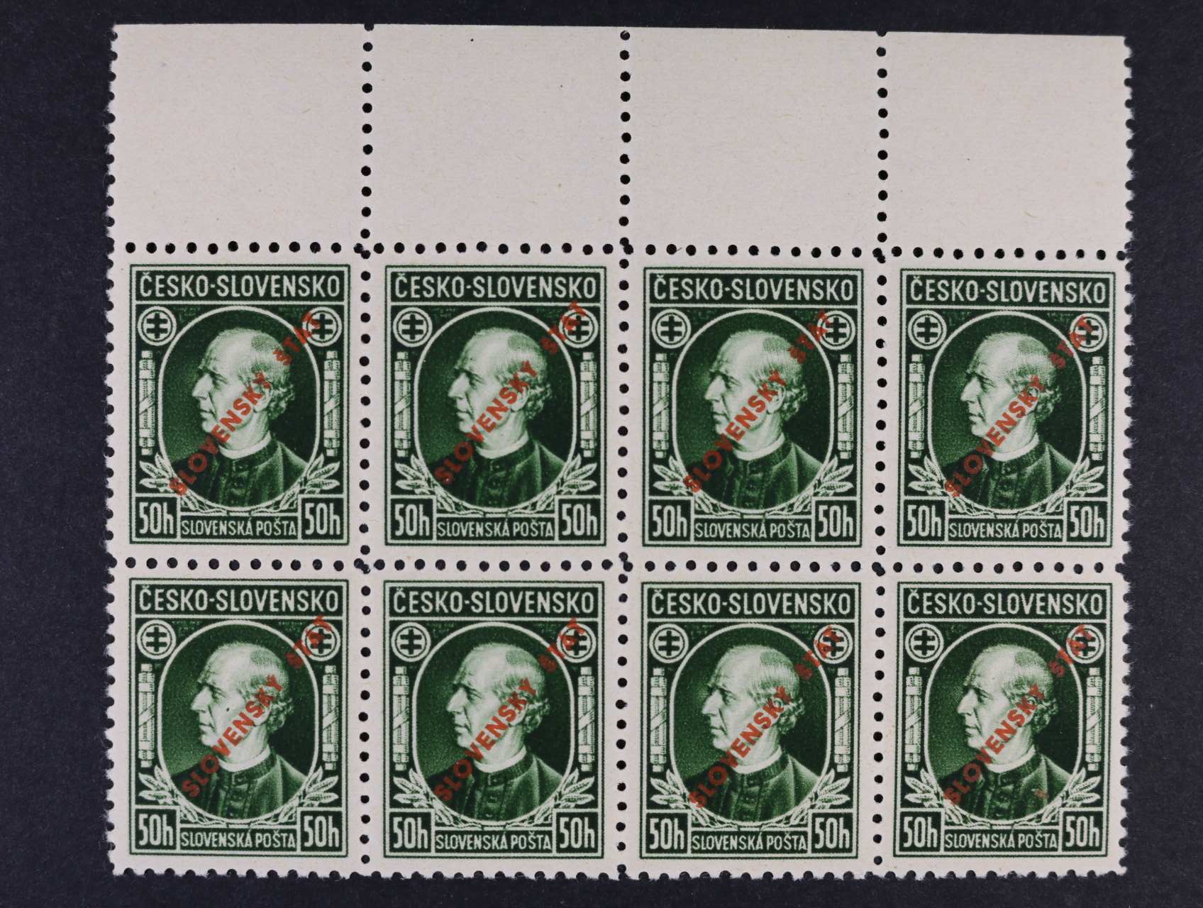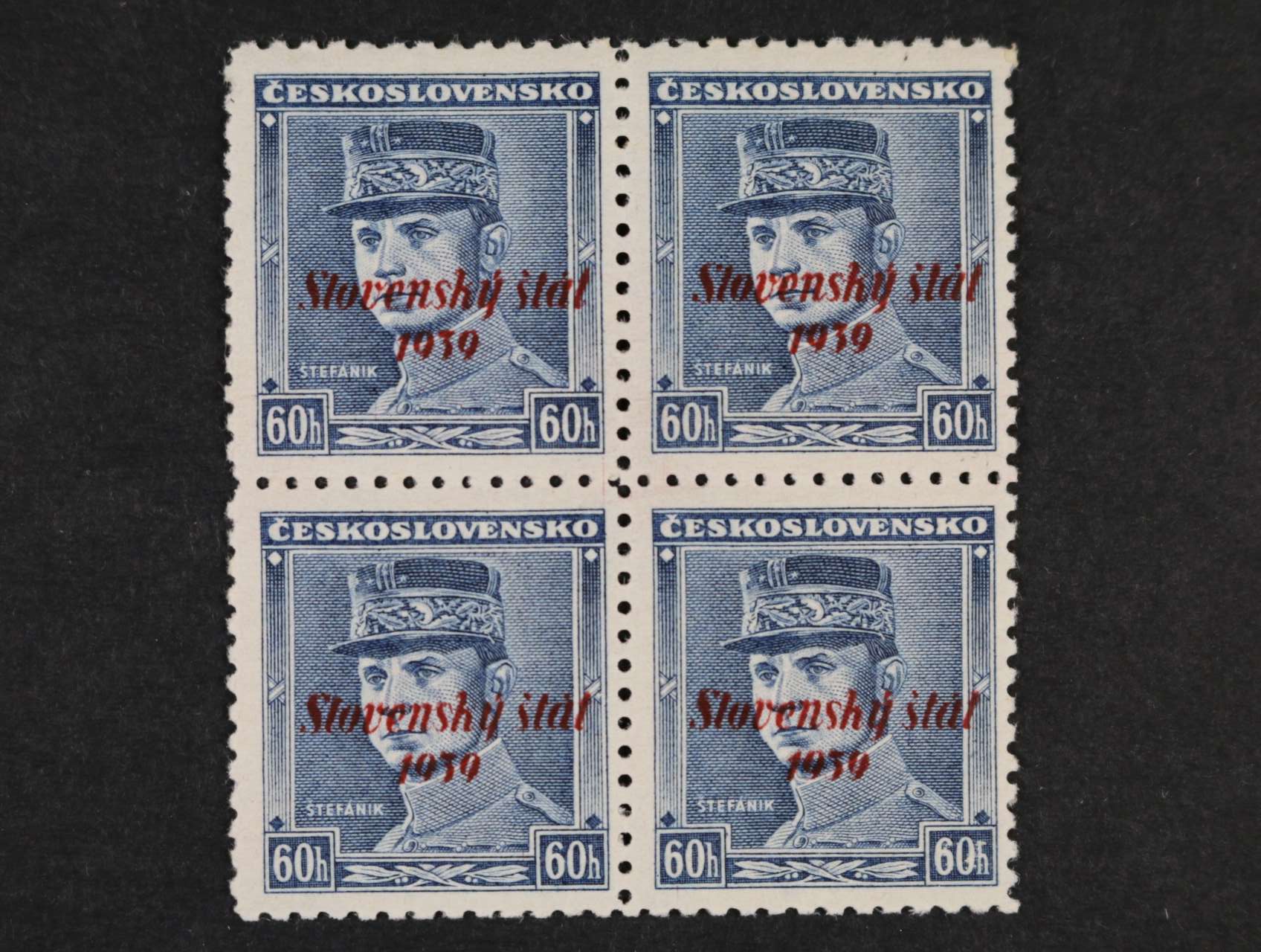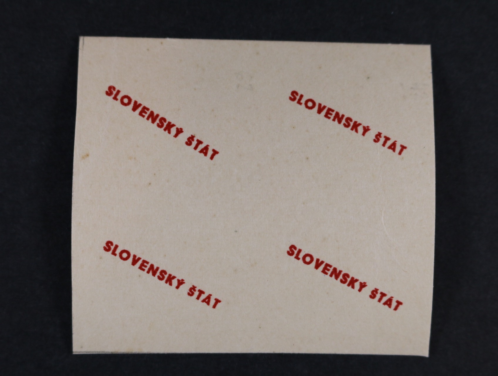 ZT přetisku na zn. č. 24 ve čtyřbloku ale v červené barvě (orig. přetisk je modrý) na kartonovém papíře, ZP 42, 43, 62, 63, zk. Synek, poprvé v aukci, dosud neznámý ZT