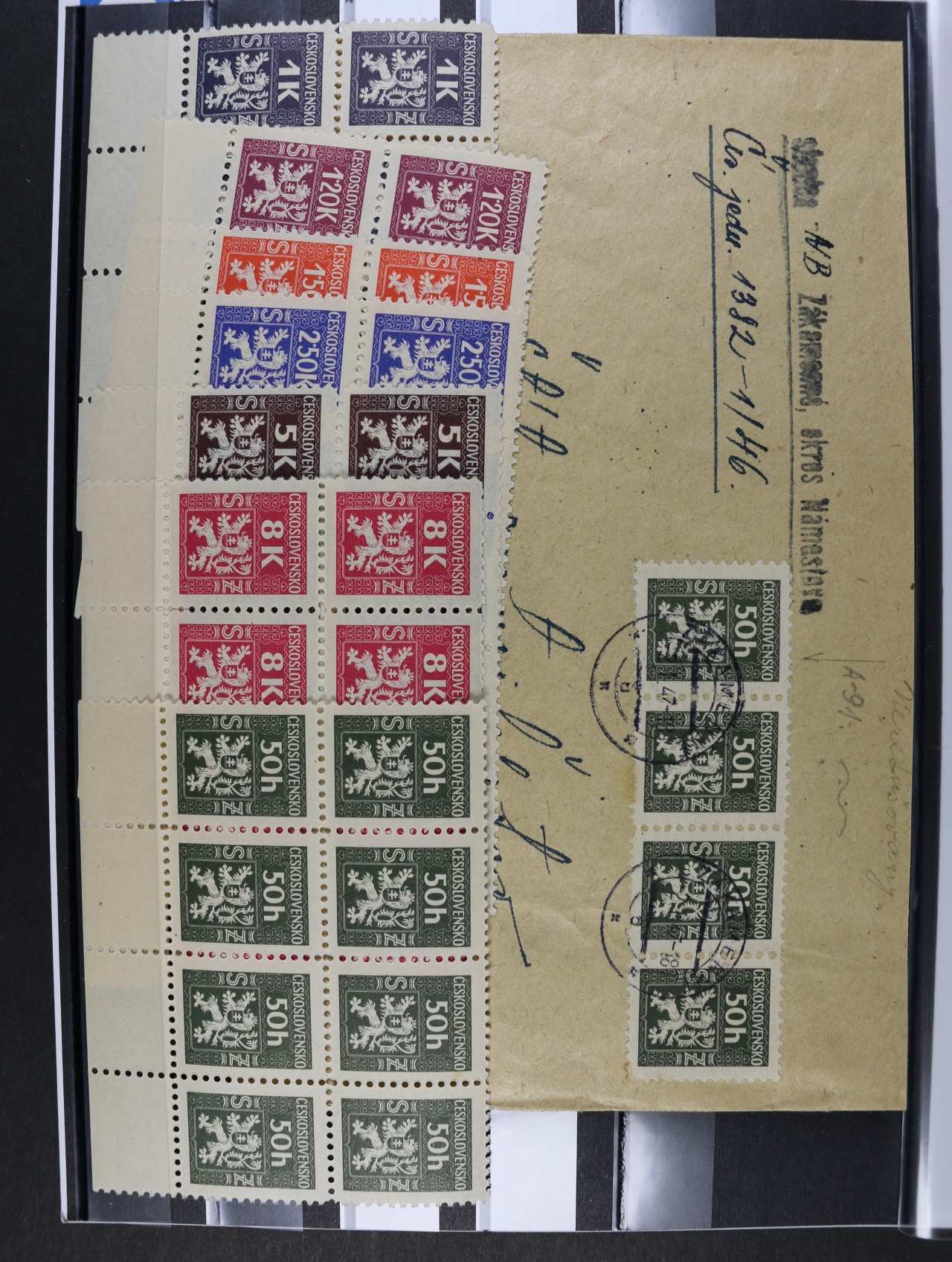 970 služební zn. SL č. 1 + SL 7 v 6ti - 8mi-blocích se spodními okraji, SL 1 s retuší DV přerušený ocas lva + služební dopis frank. čtyřpáskou zn. SL 1 s DV přerušený ocas lva, pod. raz. NÁMESTOVO 2.1.47, zajímavé 600