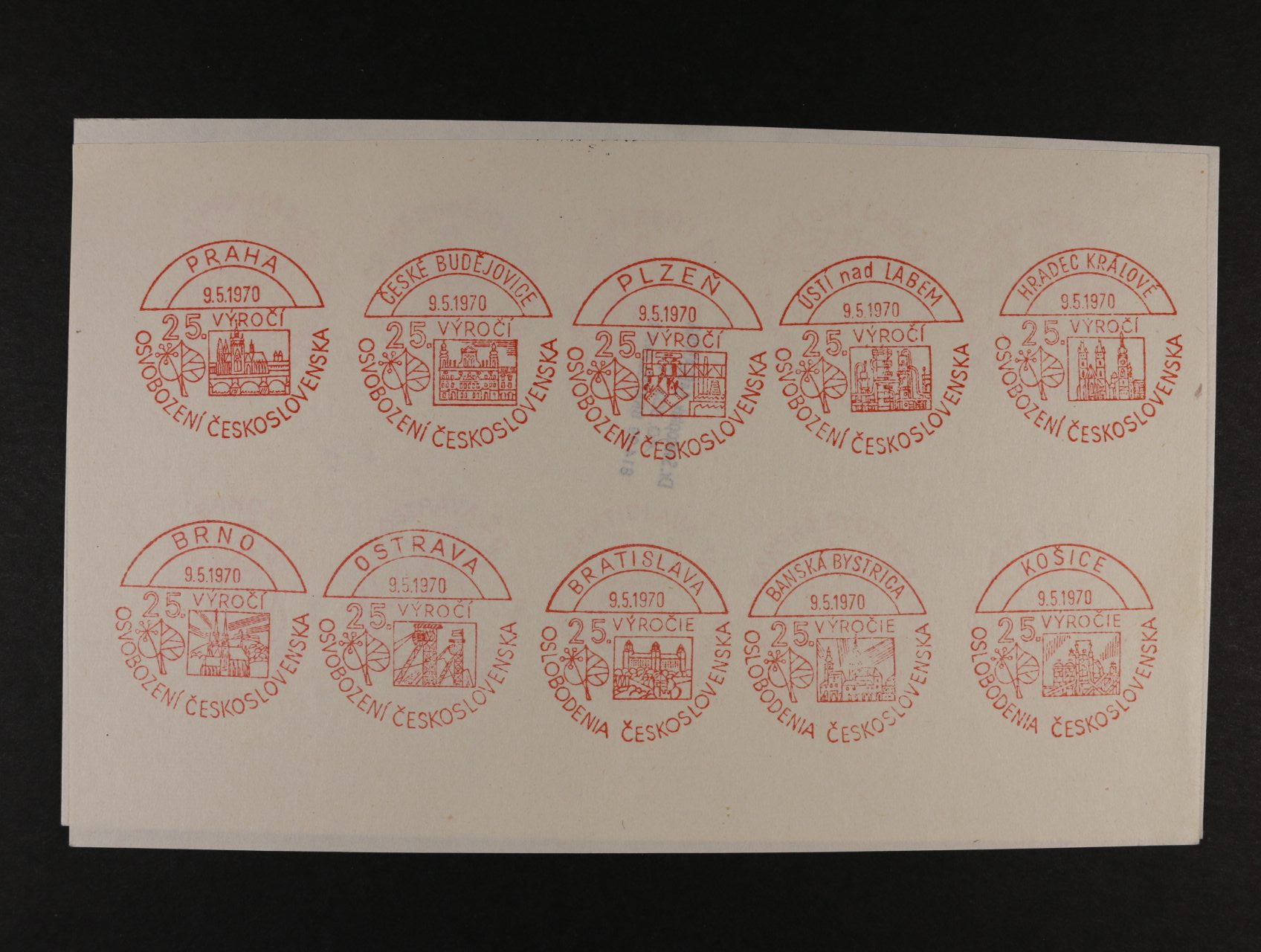 975 zkusmé otisky pam. razítek v červené barvě k 25. výr. osvobození Československa 9.5.1970 , které byly používány v 10ti městech v ČSR + dtto k 30tému výr. osvobození ČSR 9.5.1975 300