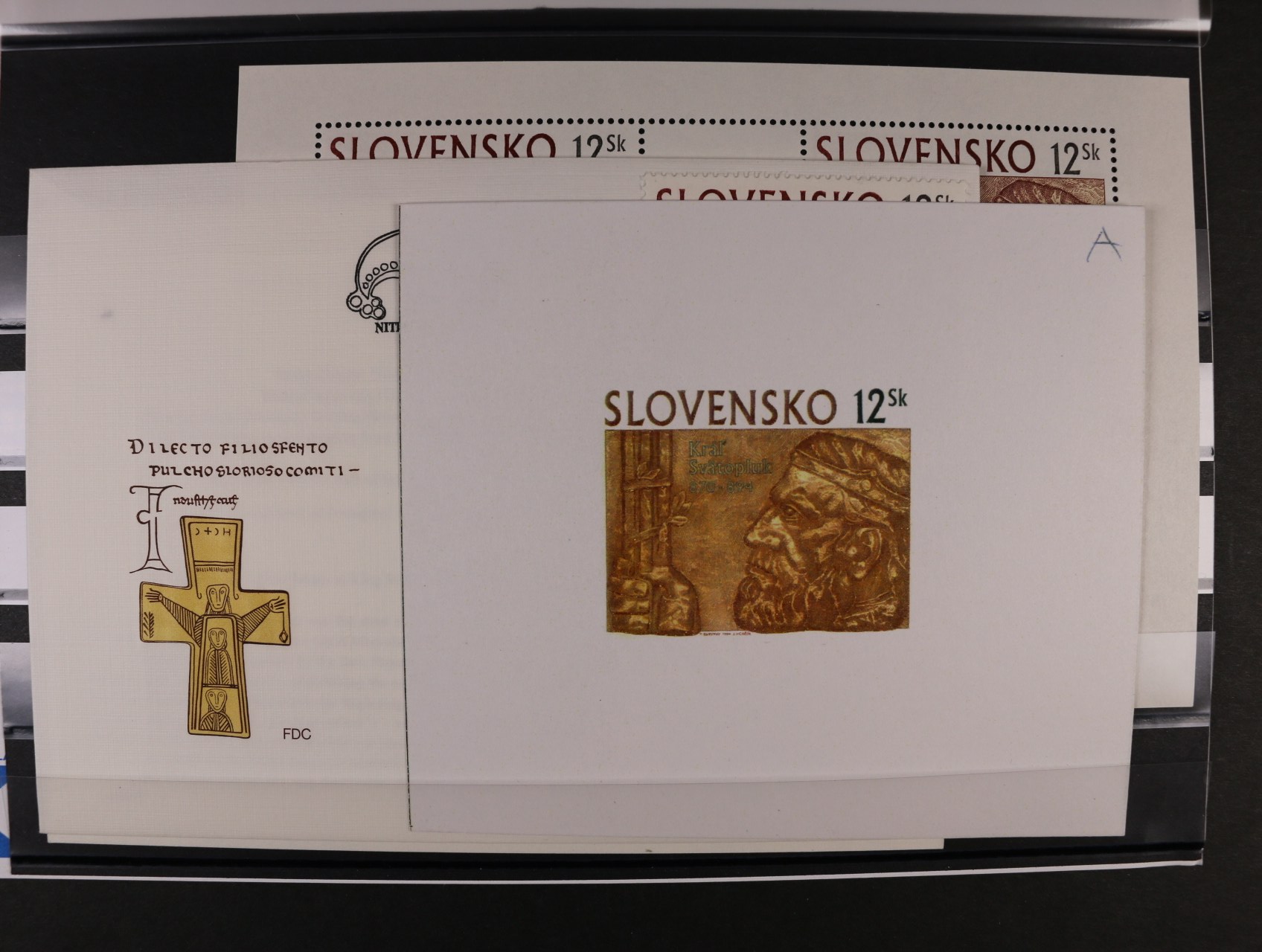 1028 otisk orig. rytiny zn. č. 133 ve zlaté barvě na kousku modrofialového papíru + otisk rytiny k obálce FDC na bílém papíře, oboje s podpisem rytce R. Cigánik + obálka FDC a PL 133 1500