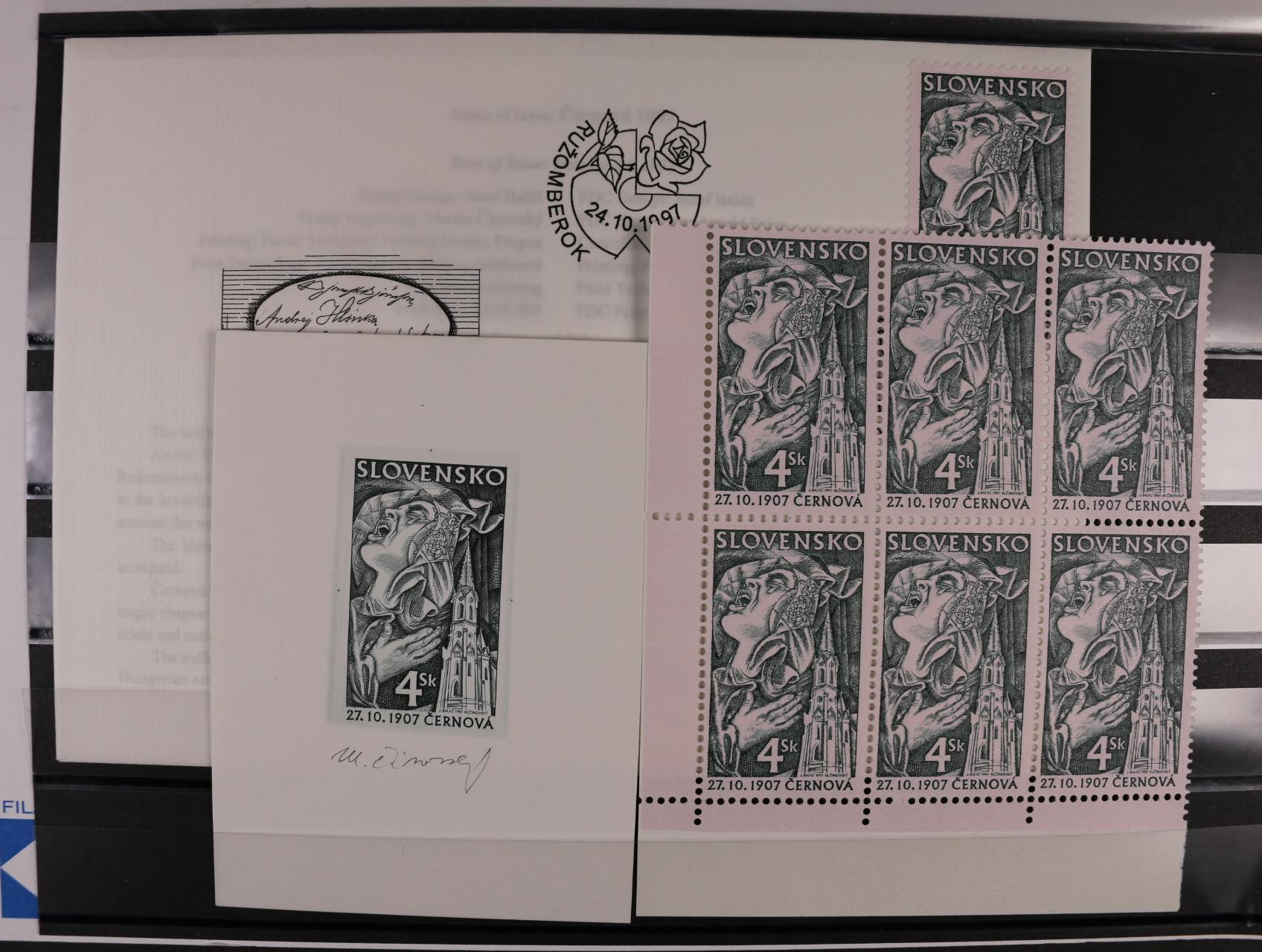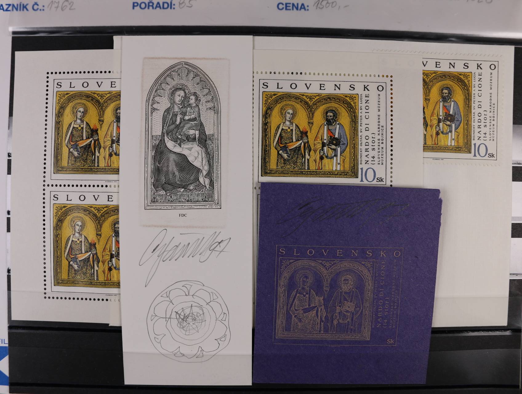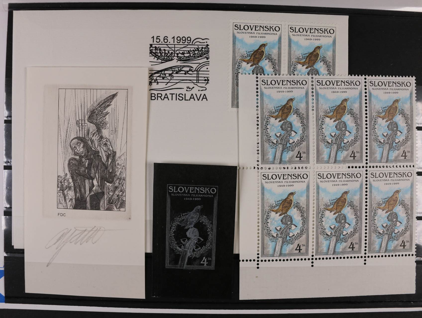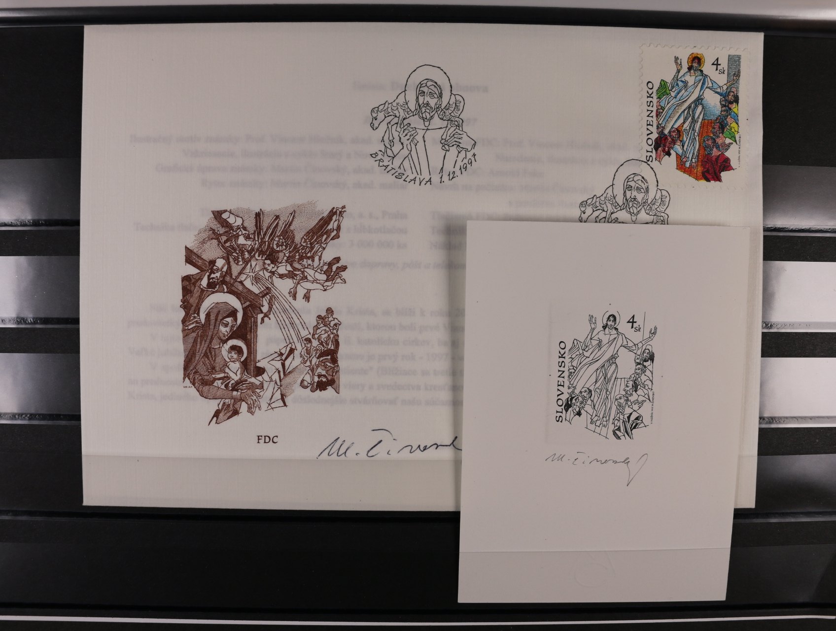 1039 otisk orig. rytiny kompl. aršíku č. 189 - 91 v černé barvě na kousku karton. papíru + otisky rytin na 3 FDC v černé barvě na kouscích karton. papíru, vše s podpisy rytce R.Cigánik + orig. aršík a obáky FDC 3000