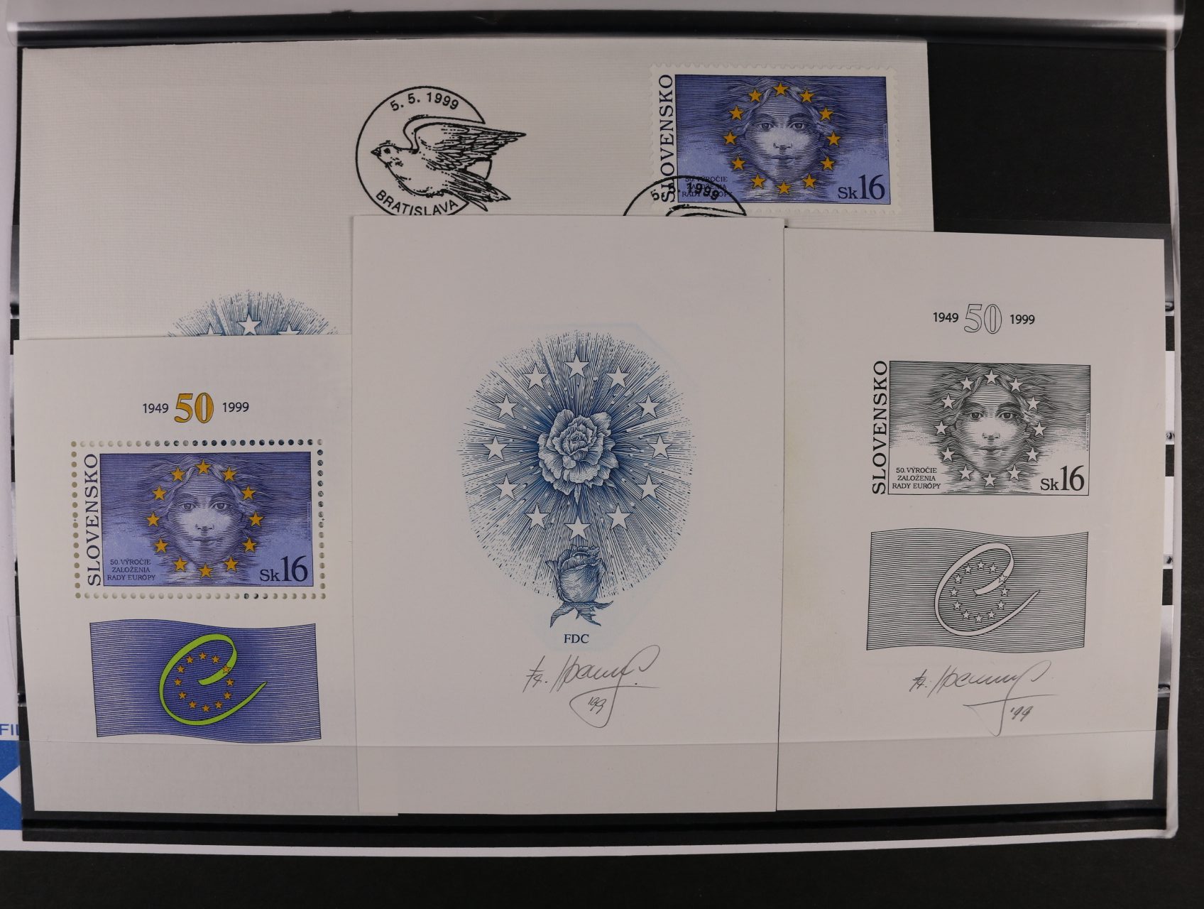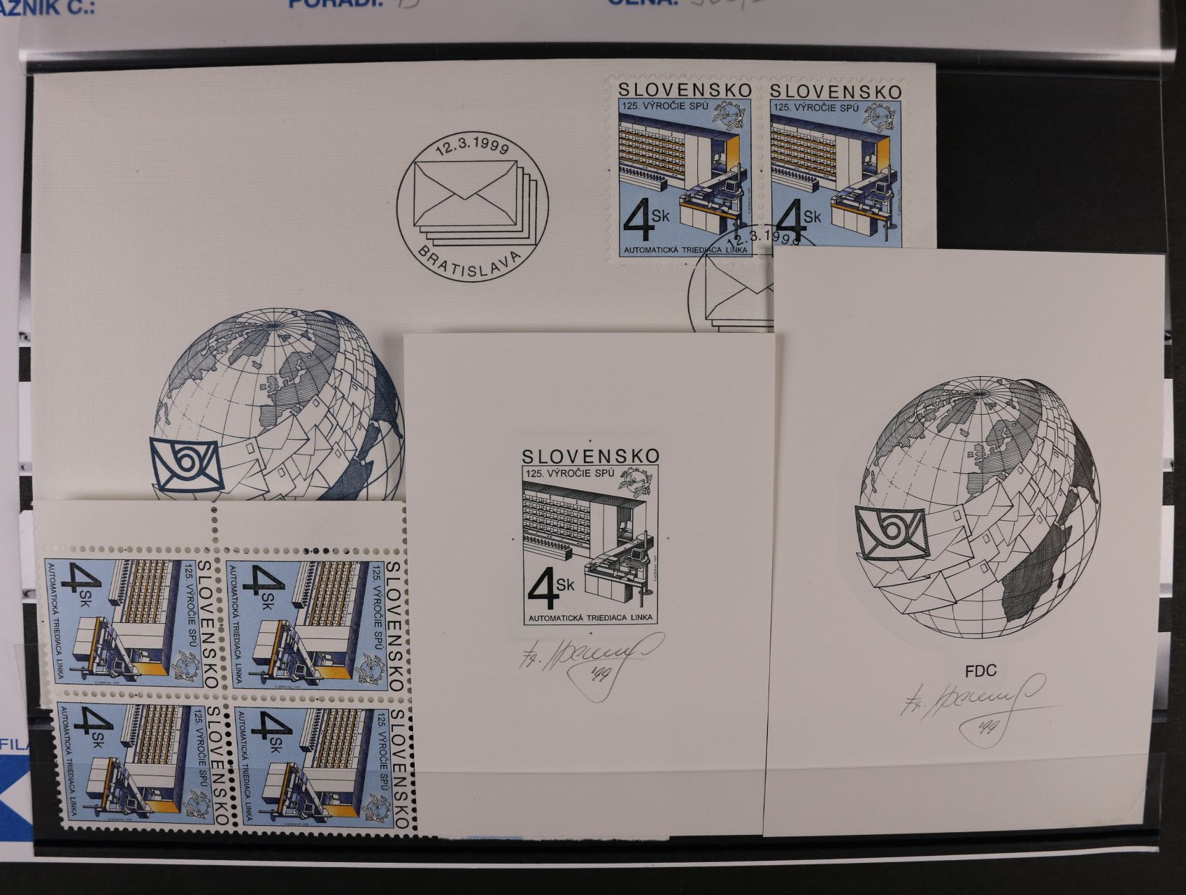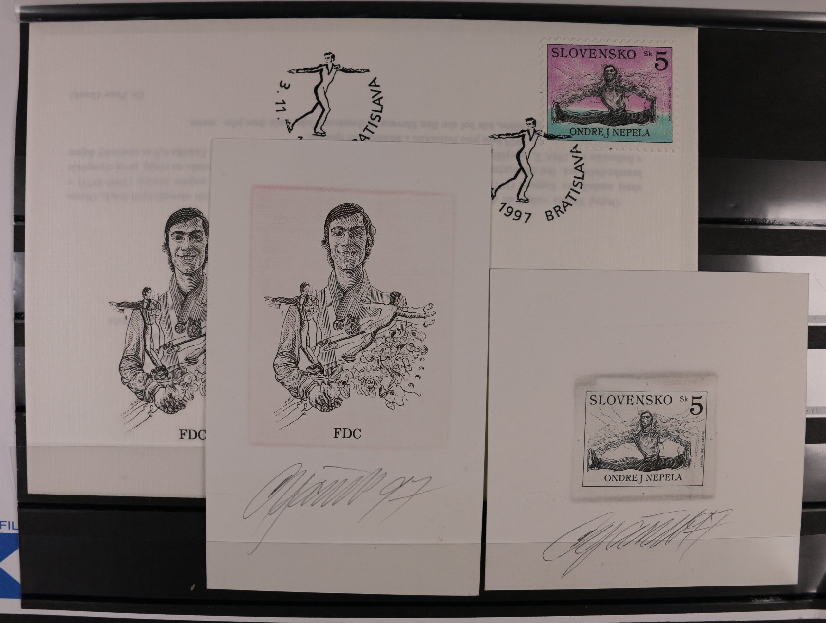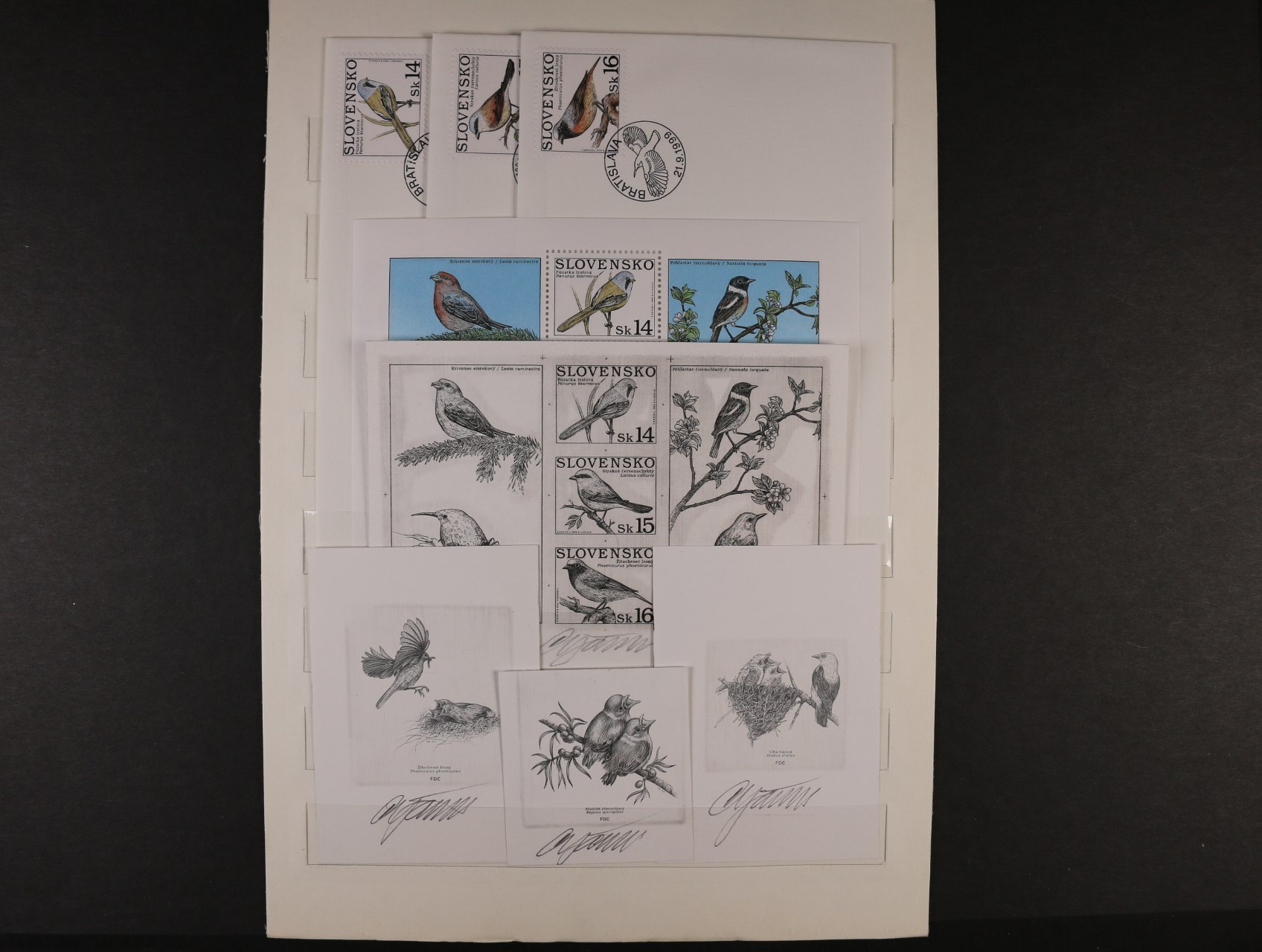 1039 otisk orig. rytiny kompl. aršíku č. 189 - 91 v černé barvě na kousku karton. papíru + otisky rytin na 3 FDC v černé barvě na kouscích karton. papíru, vše s podpisy rytce R.Cigánik + orig. aršík a obáky FDC 3000