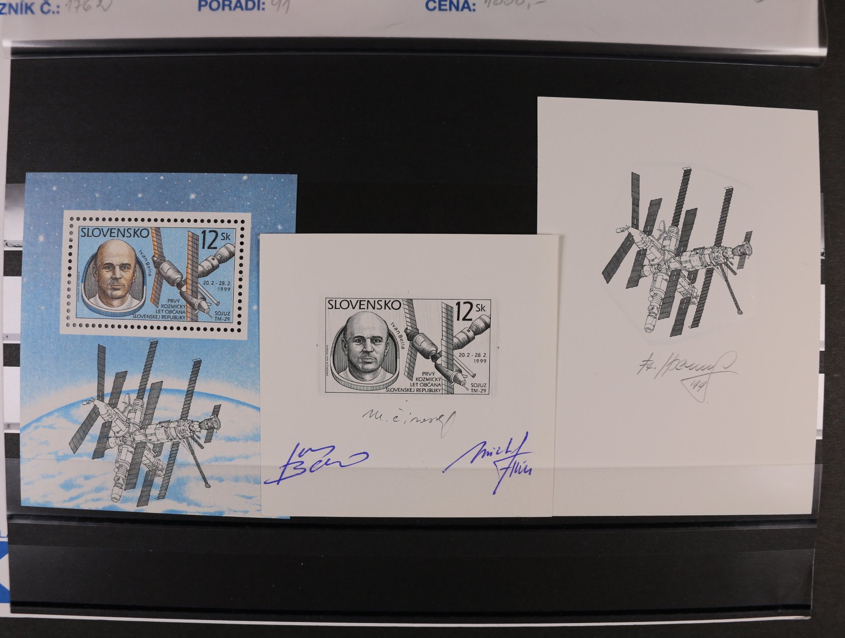 1038 otisk orig. rytiny zn. č. 183 v barvě černé na kousku kříd. kartonu s podpisem rytce M. Čnovský a kosmonauta Ivana Bella + otisk rytiny na spodní části aršíku s podpisem rytce F. Horniak + orig. aršík 1000