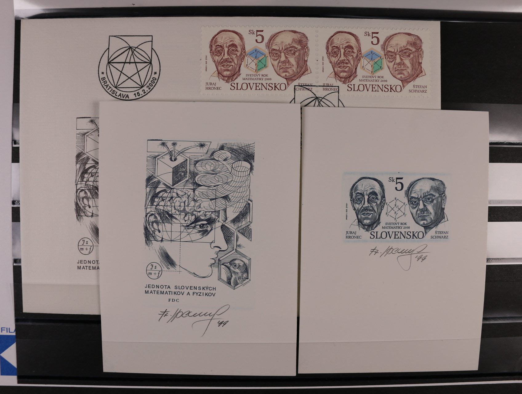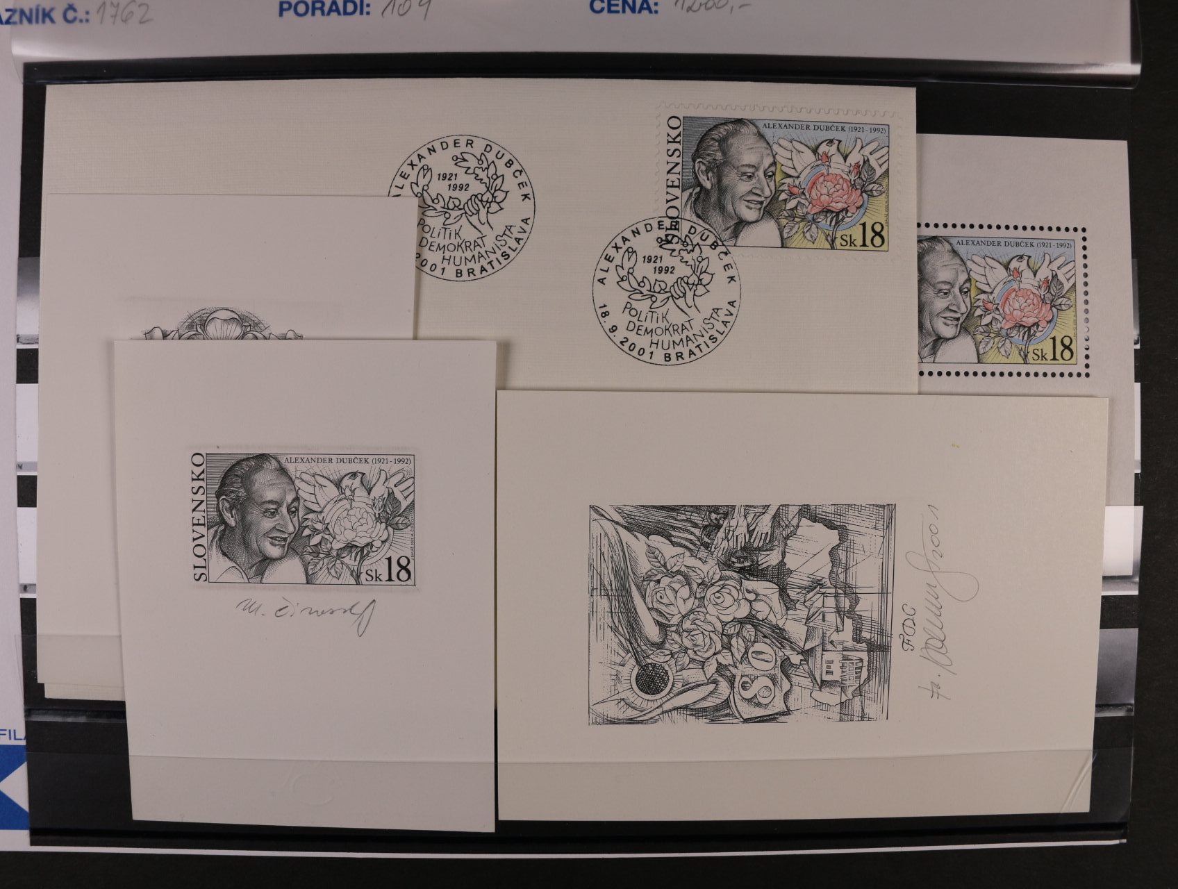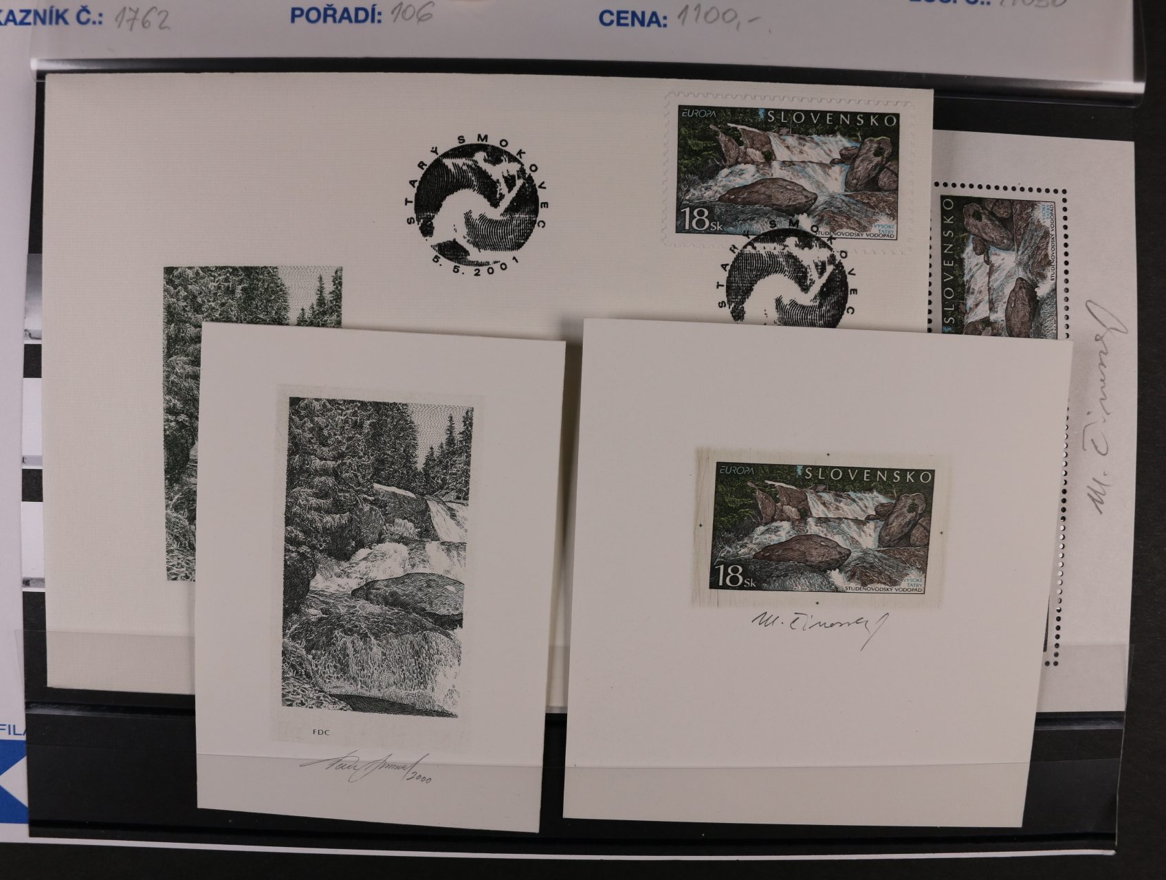 1046 otisk orig. rytiny zn. č. 211 v barvě fialové, modré, hnědé a černošedé na kouscích kříd. kartonu s podpisy rytce M. Činovský + rohový čtyřblok a obálka FDC s podpisem prezidenta R. Schustera 2000
