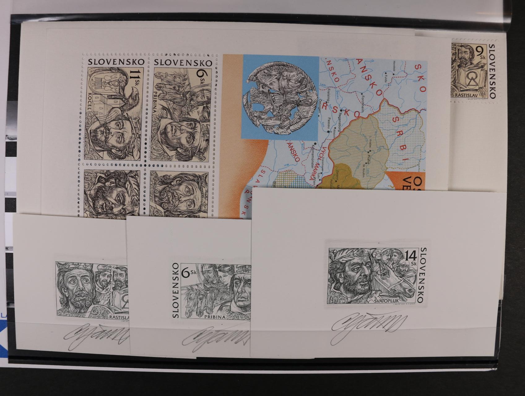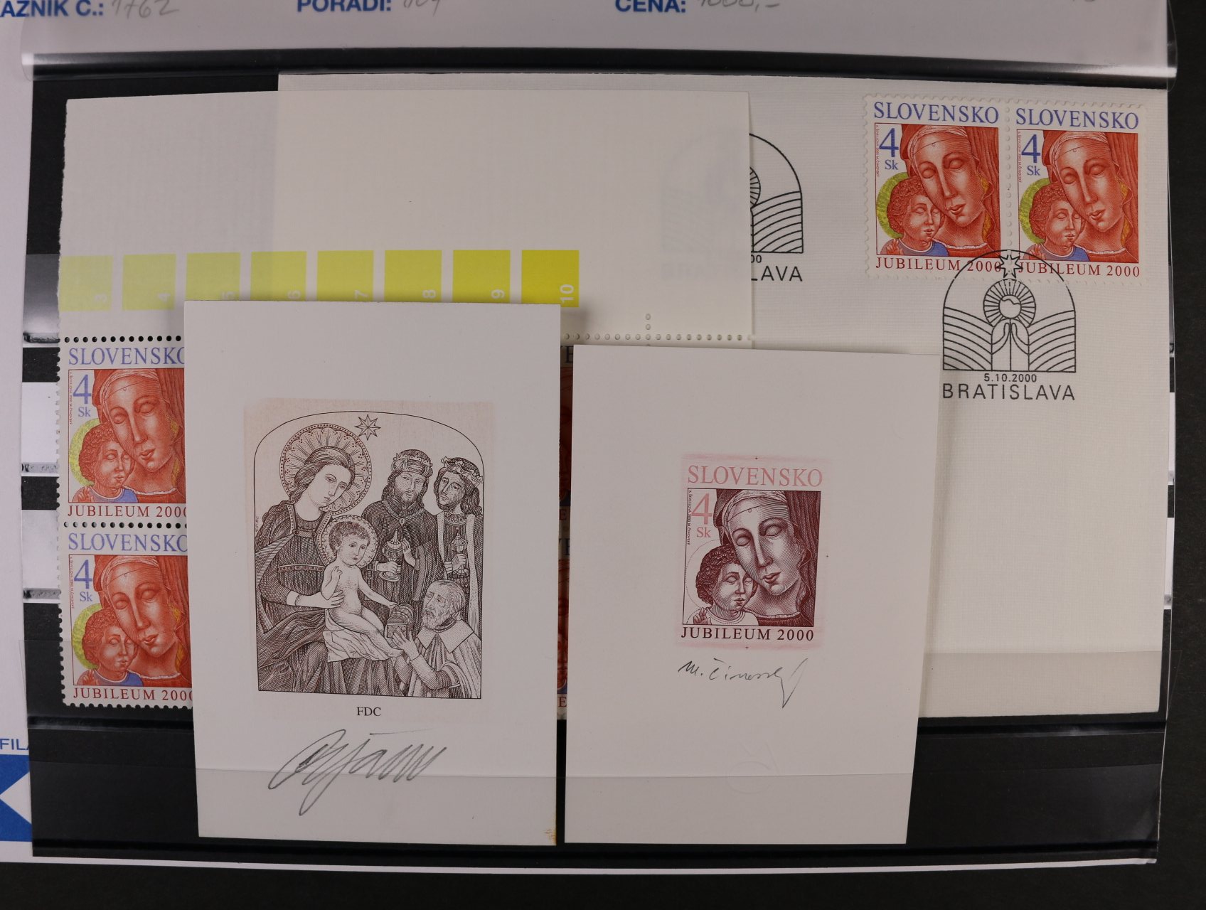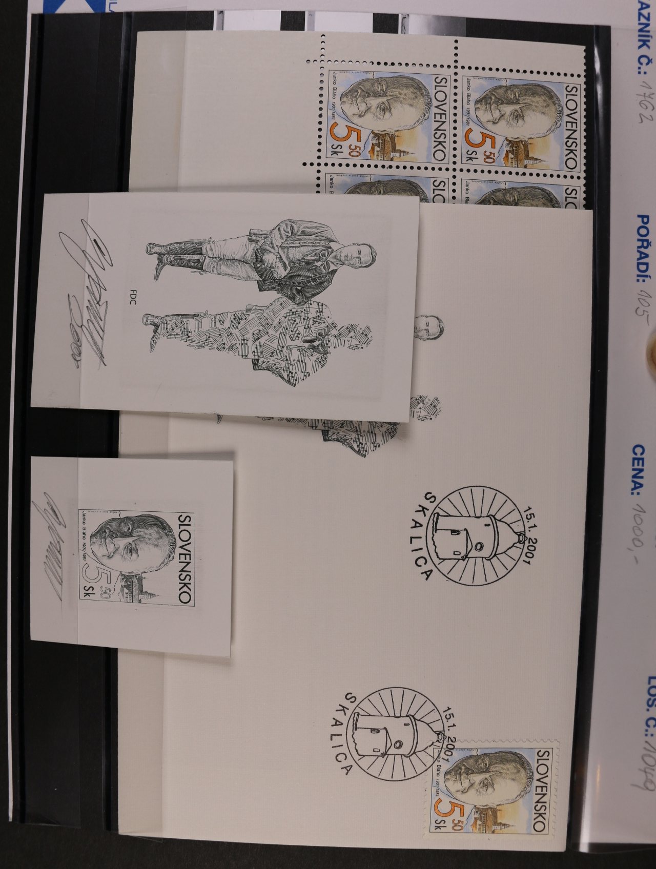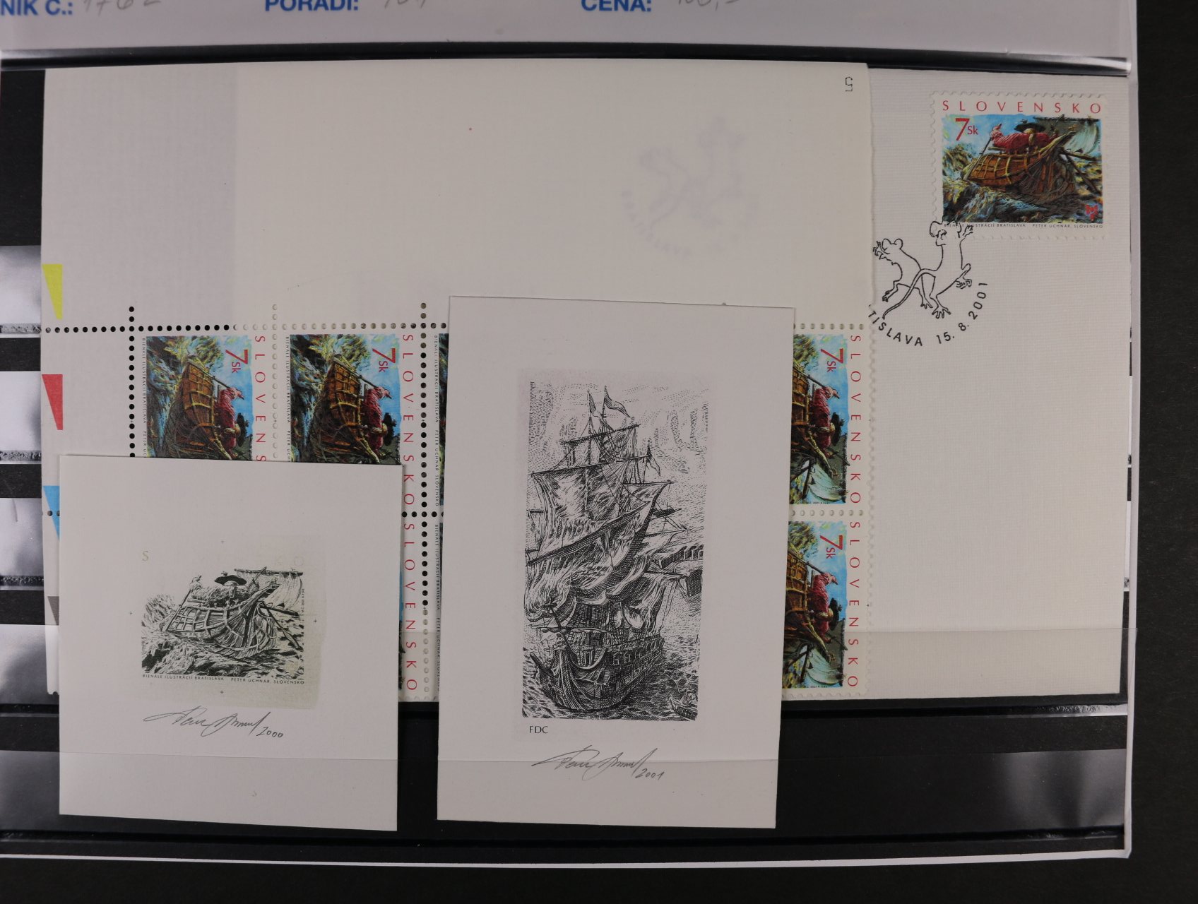 1046 otisk orig. rytiny zn. č. 211 v barvě fialové, modré, hnědé a černošedé na kouscích kříd. kartonu s podpisy rytce M. Činovský + rohový čtyřblok a obálka FDC s podpisem prezidenta R. Schustera 2000