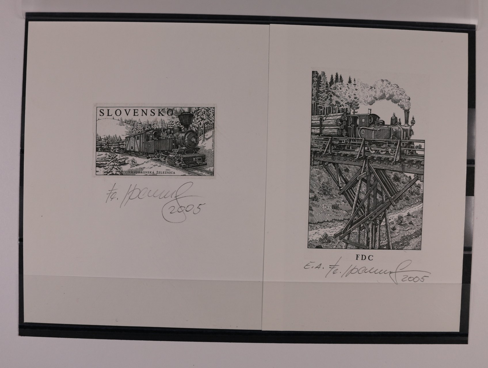 1054 otisk orig. rytiny zn. z r. 2005 Čiernohorská železnica + otisk rytiny k FDC v černé barvě na kouscích kříd. papíru s podpisy rytce F. Horniak 900