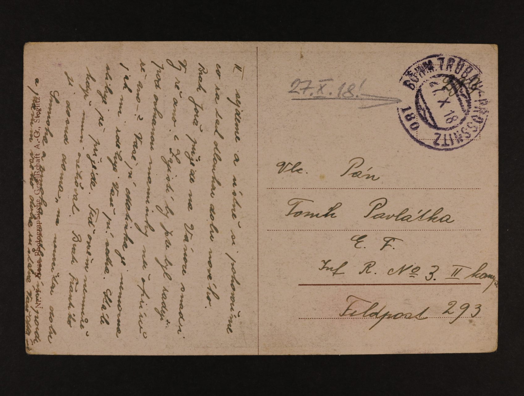1060 pohlednice zaslaná na FP s pod. raz. VLP č. 180 BÖHM. TRUBAU - PROSSNITZ 27.10.18 200