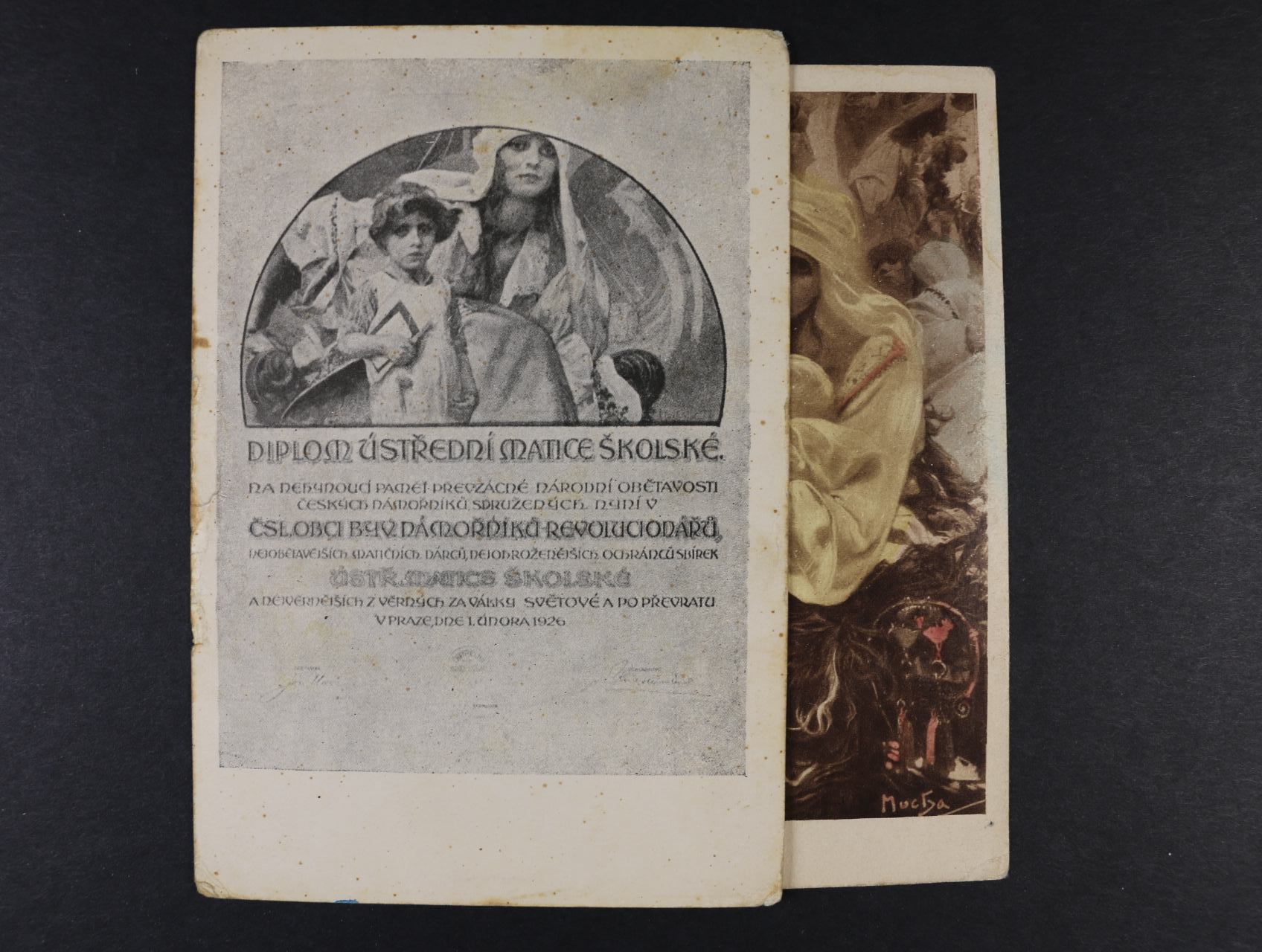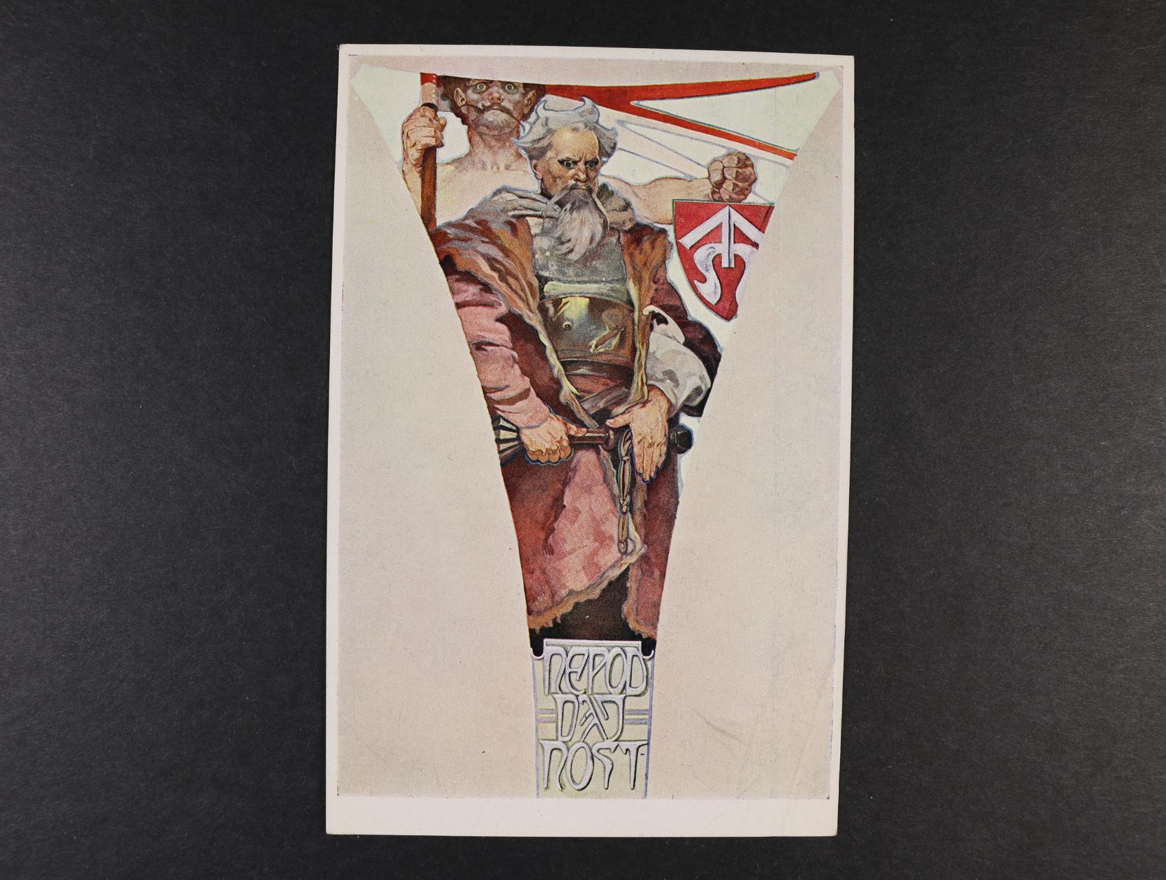 1110 A. Mucha - jednobar. pohlednice DIPLOM ÚSTŘEDNÍ MATICE ŠKOLSKÉ ..., kolorovaná pohl. SLOVANSKÁ EPOPEJ - SLAVNOST SVANTOVÍTOVA, barevná pohl. NAROZENÍ PÁNĚ, nepoužité, kvalita k prohlédnutí 500