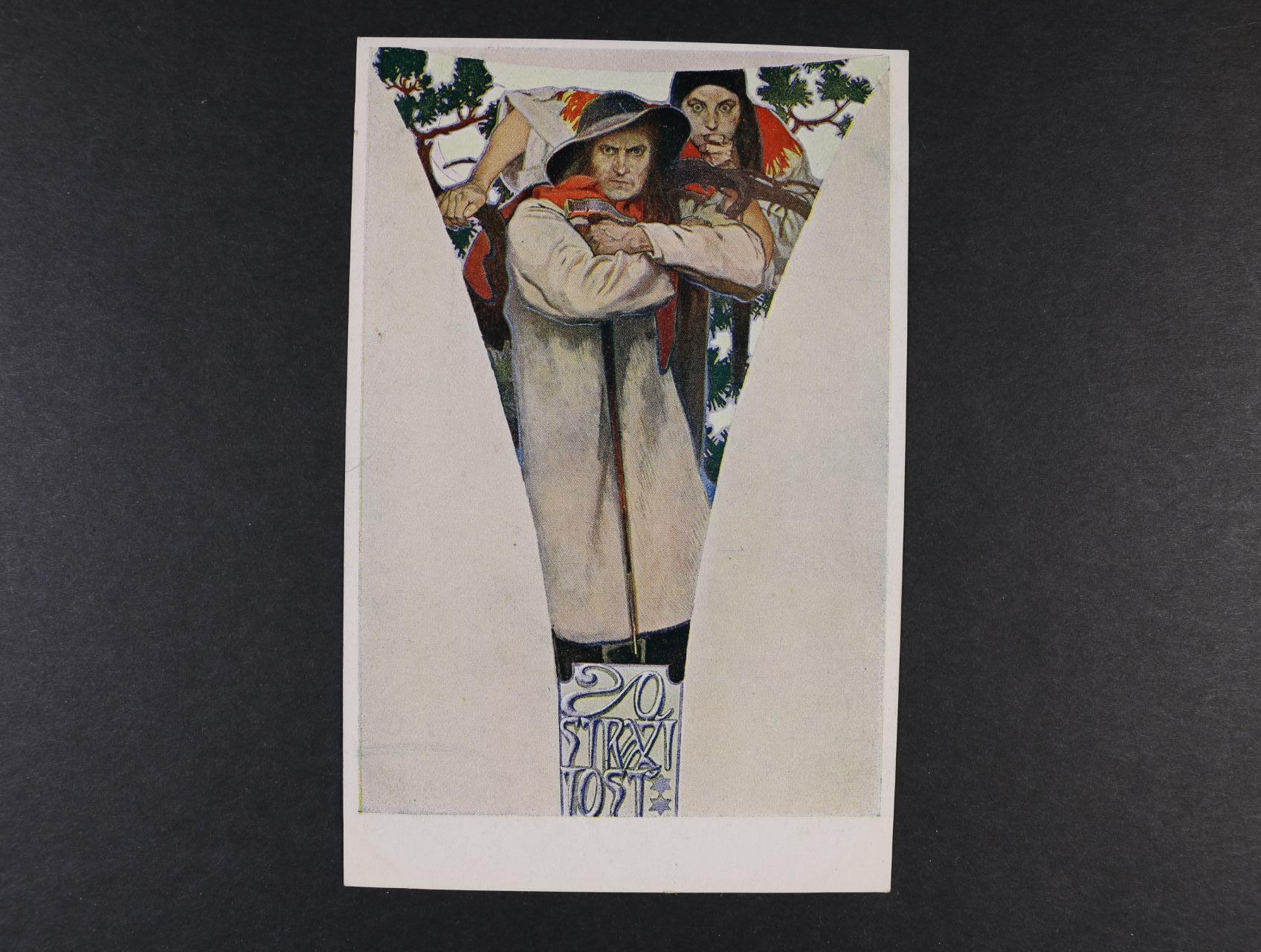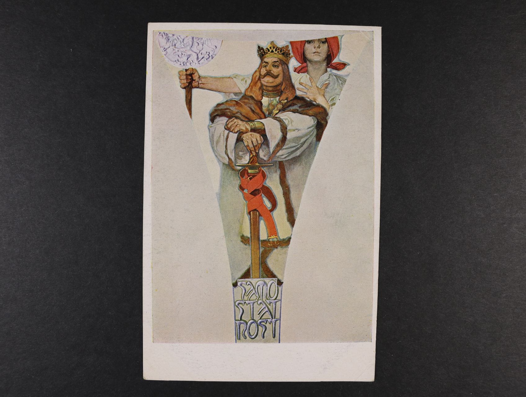 1104 A. Mucha - bar. pohl. "Samostatnost", nepoužitá, slabé lomy v horních rožcích 200