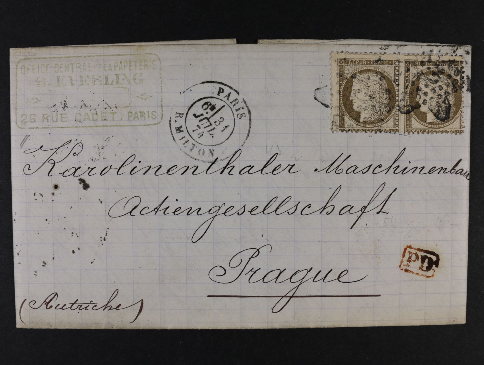 1318 skl. dopis do Prahy z r. 1874 frank. dvoupáskou zn. Mi. č. 54 s němým hvězdicovým raz. + denní raz. PARIS 31.JUL.74 + firemní raz. 300