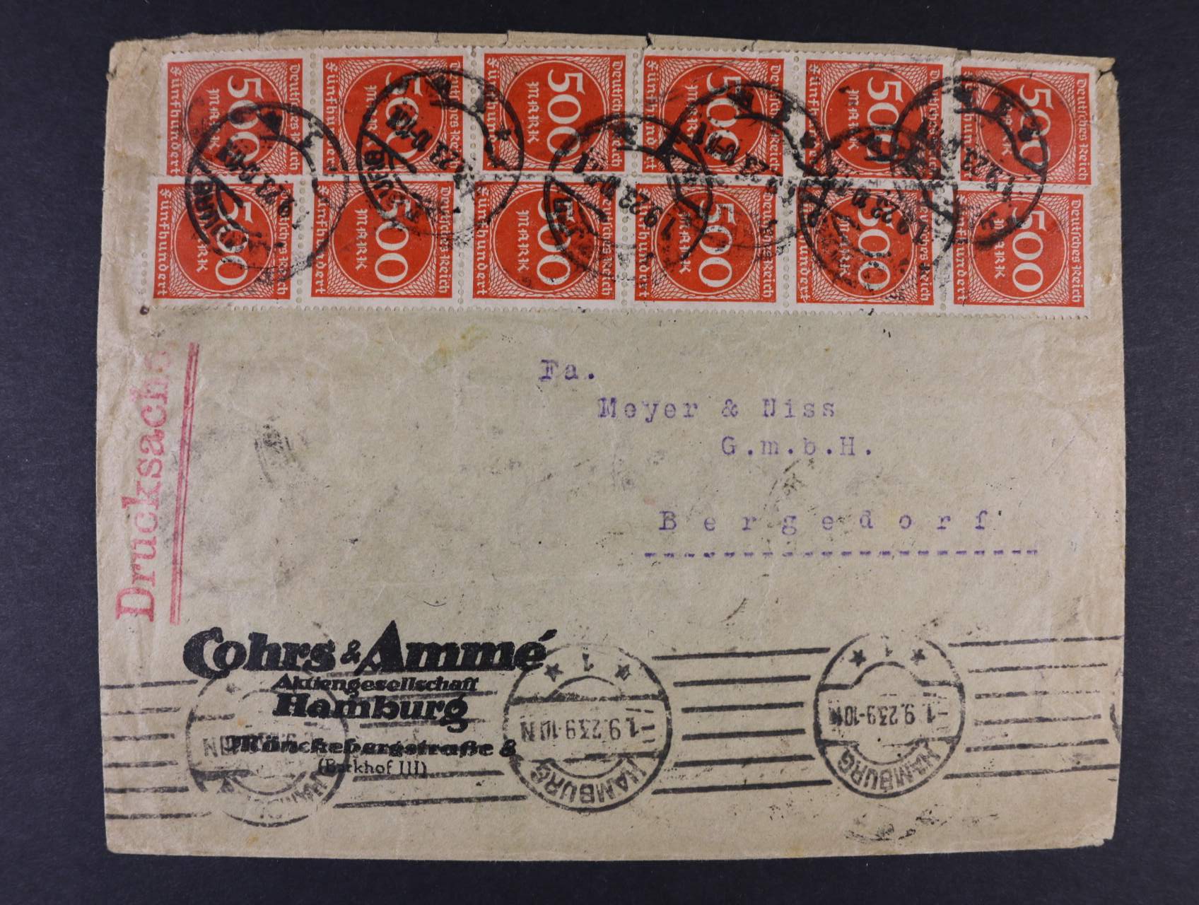 firemní tiskopis frank. na přední i zadní straně zn. Mi. č. 272 30 x, pod. raz. HAMBURG 1.9.23, zajímavé, cca 250 EUR