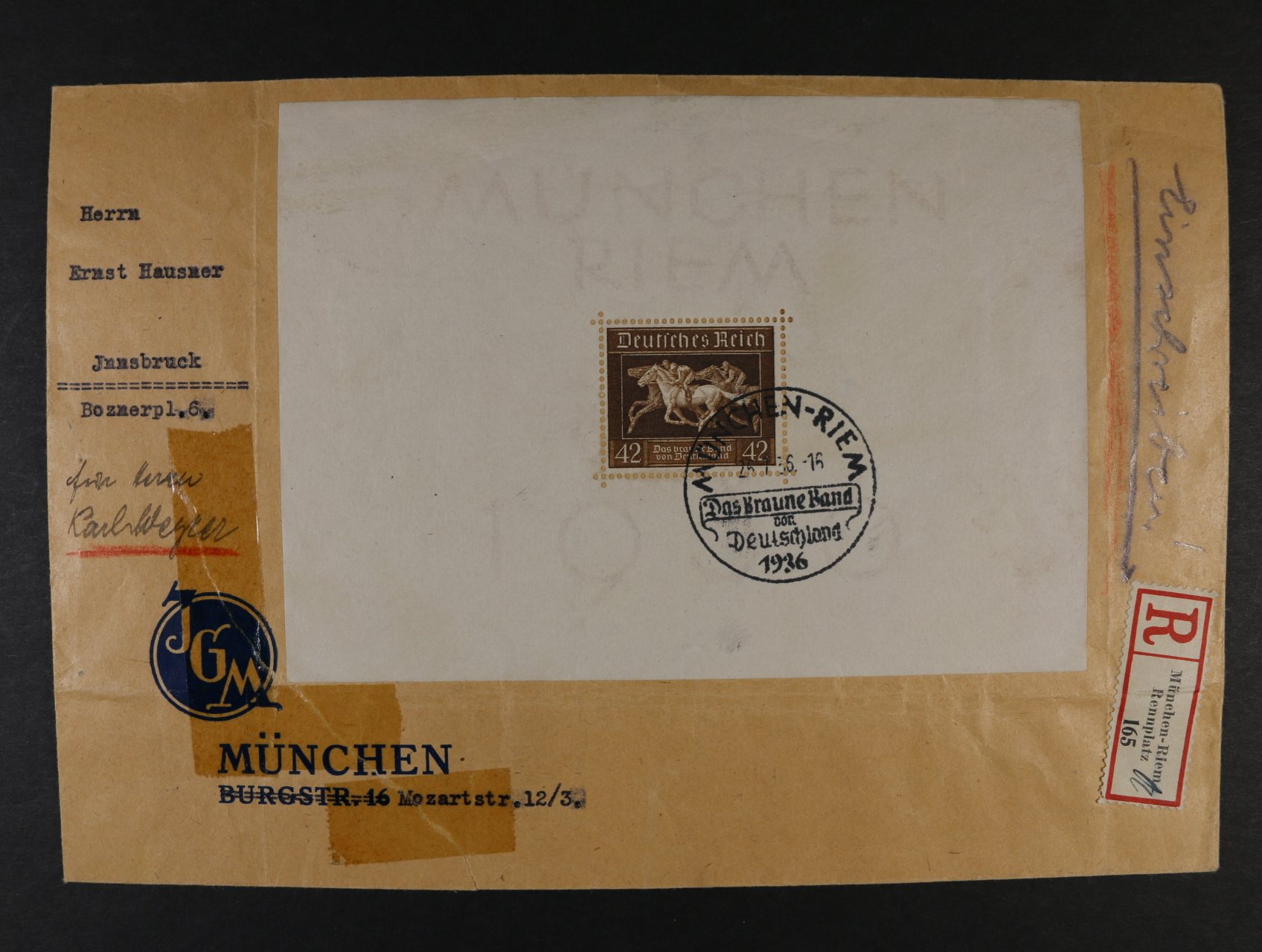 firemní R-dopis frank. Bl. Mi. 4, pod. raz. MÜNCHEN - RIEM ...25.7.36, v levém rohu dopis natržen