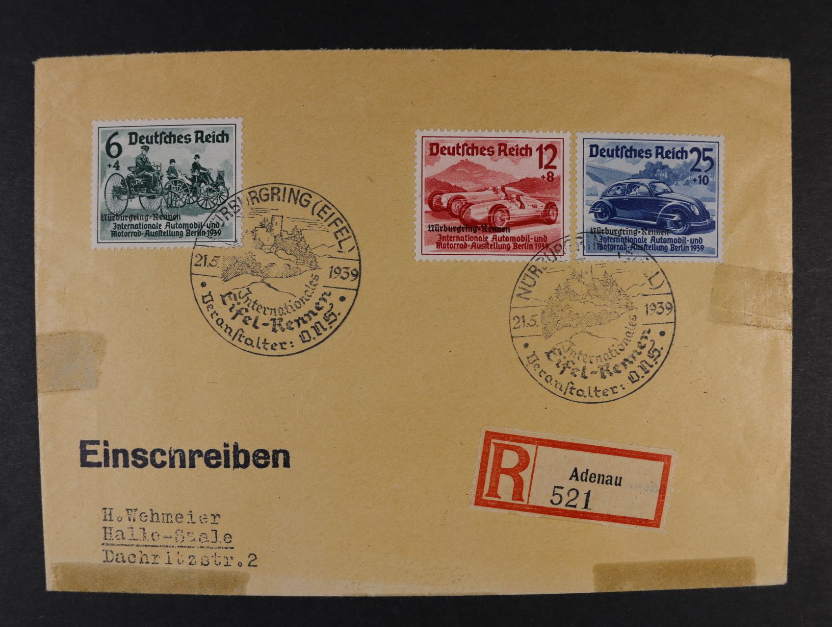 R-dopis frank. zn. Mi. č. 659 - 97, pod. raz. NÜRNBURGRING 21.5.39, přích. raz., na dopise mastné skvrny po lepící pásce, cca 160 EUR
