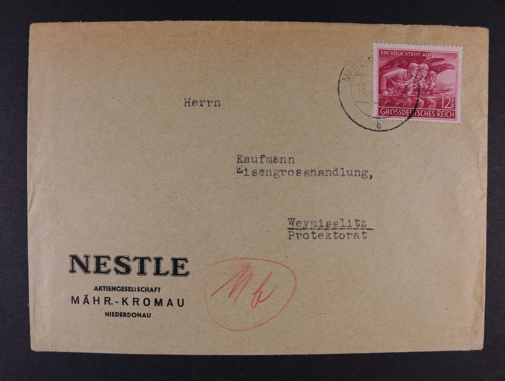 firemní dopis do Protektorátu frank. zn. Mi. č. 908, pod. raz. MÄHR. KROMAU