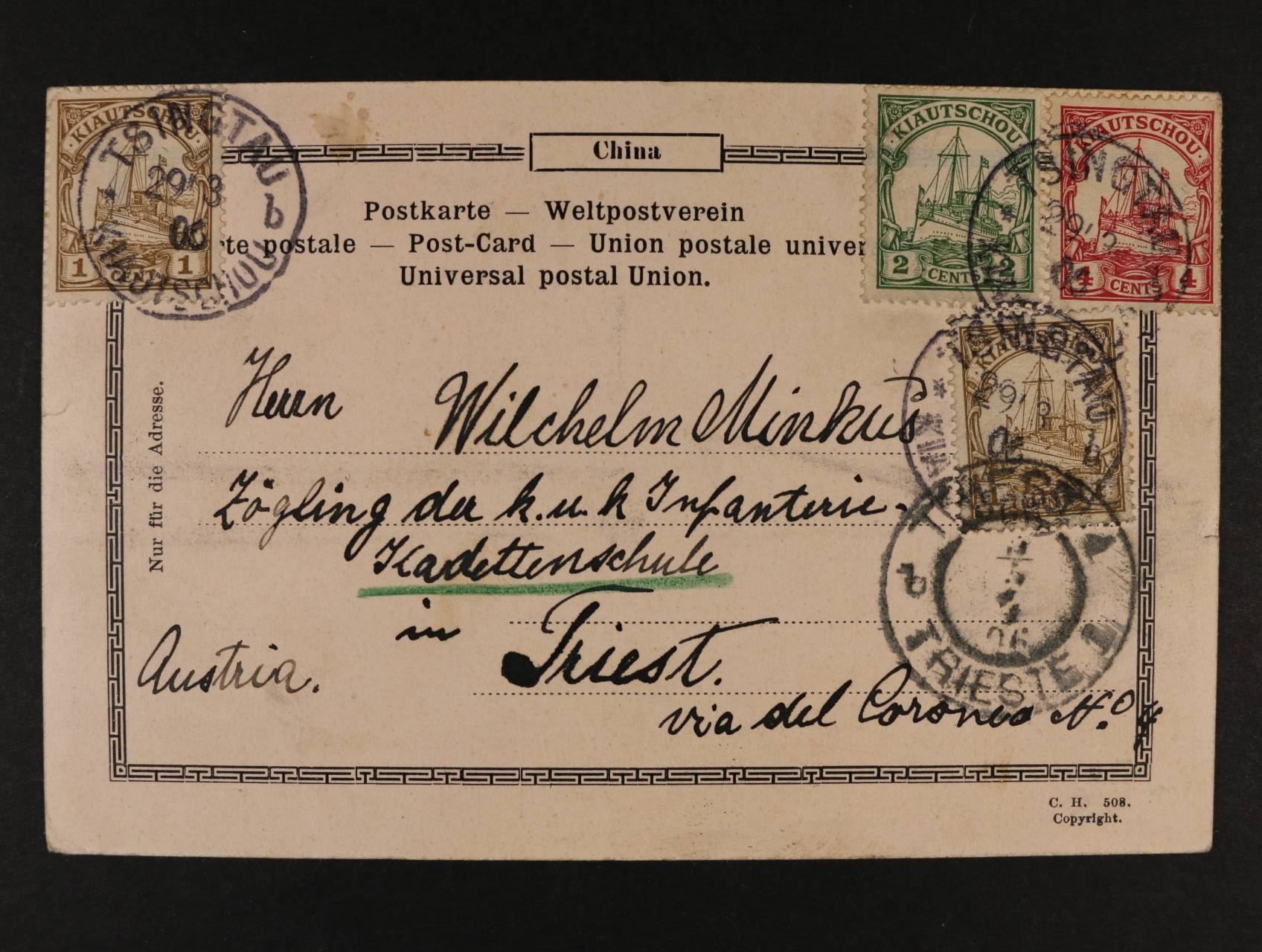 Kiautschau - jednobar. pohlednice Tsingtau do Terstu frank. zn. Mi. č. 18 (2x), 19, 20, pod. raz. TSINGTAU 29.3.06 + přích. raz.