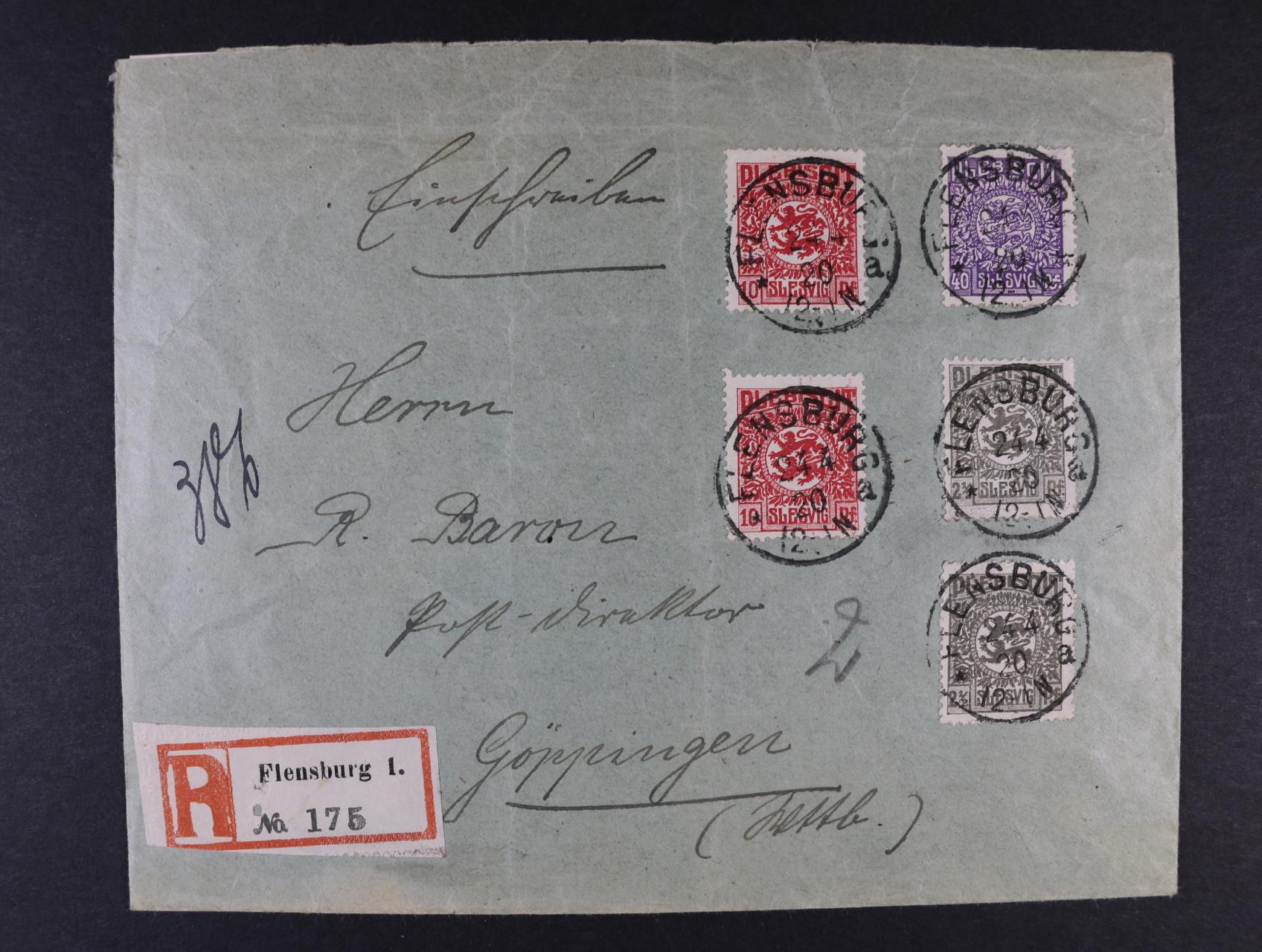 Schlesvig - R-dopis frank. zn. Mi. č. 1 (2x), 4, 9 (2x), pod. raz. FLENSBURG 24.4.20, přích. raz. GÖPINGEN