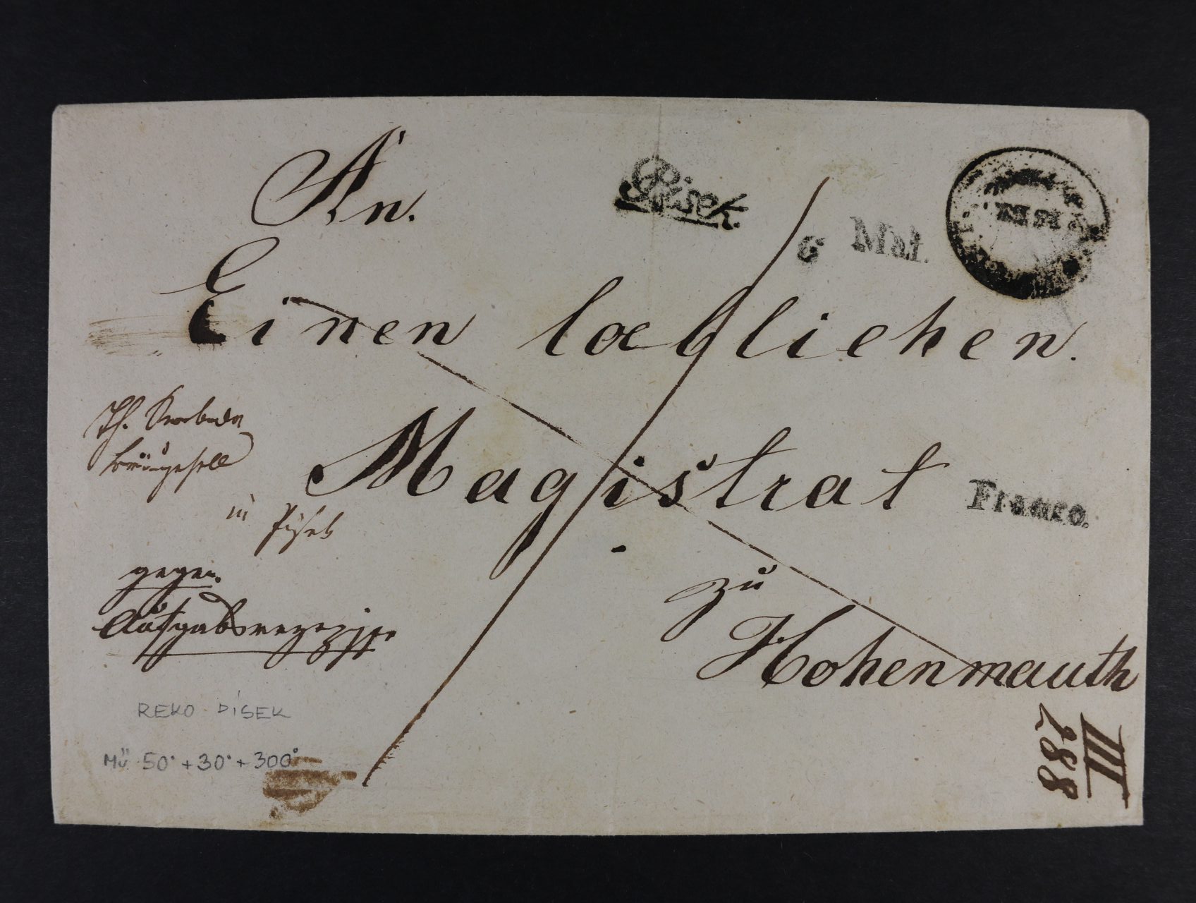 obálka do Vysokého Mýta s řádkovým raz. Písek 6. Mai, přídavné řádkové raz. Franco a oválné raz. RECOMMANDIRT PÍSEK, vzácné