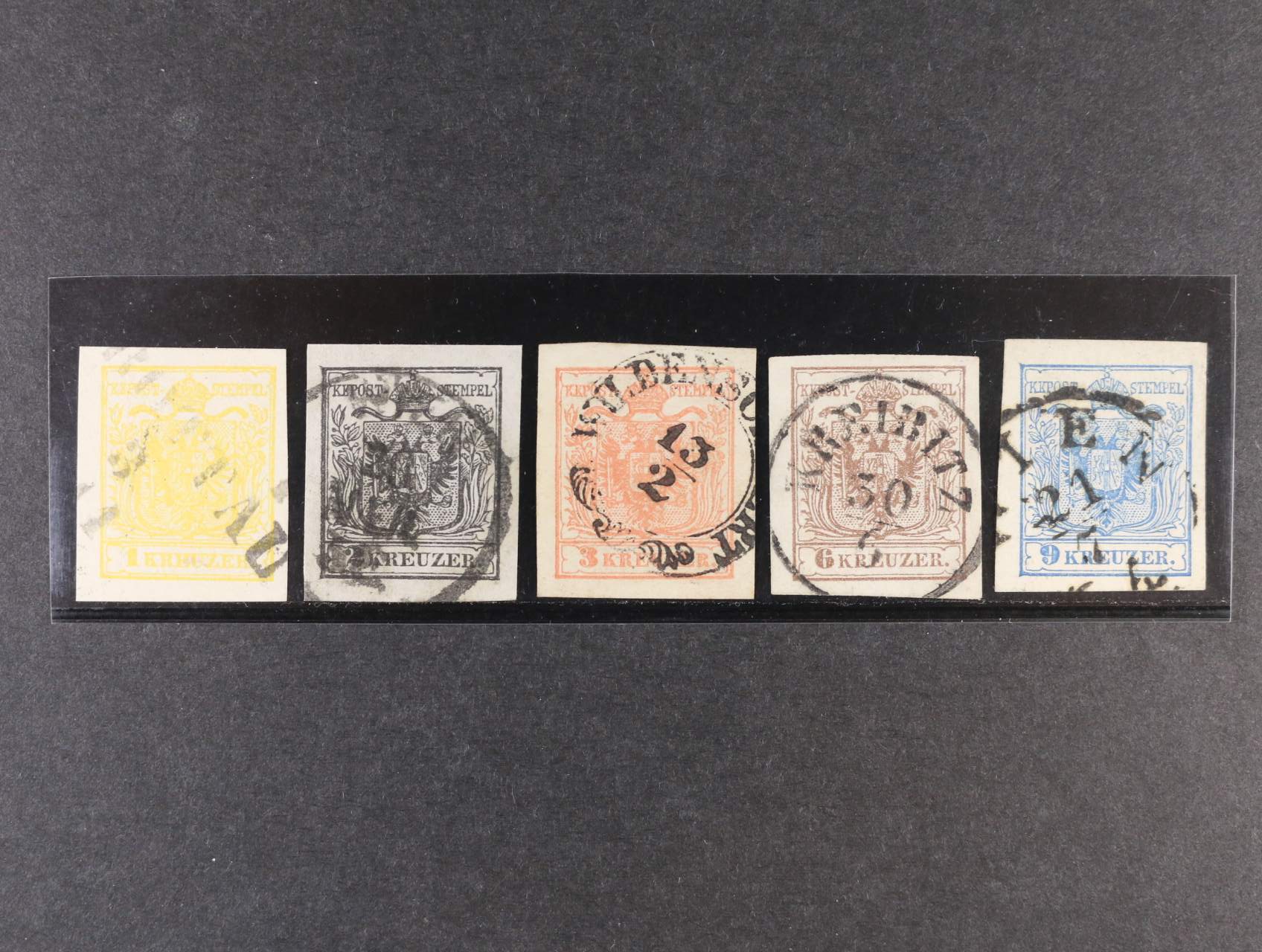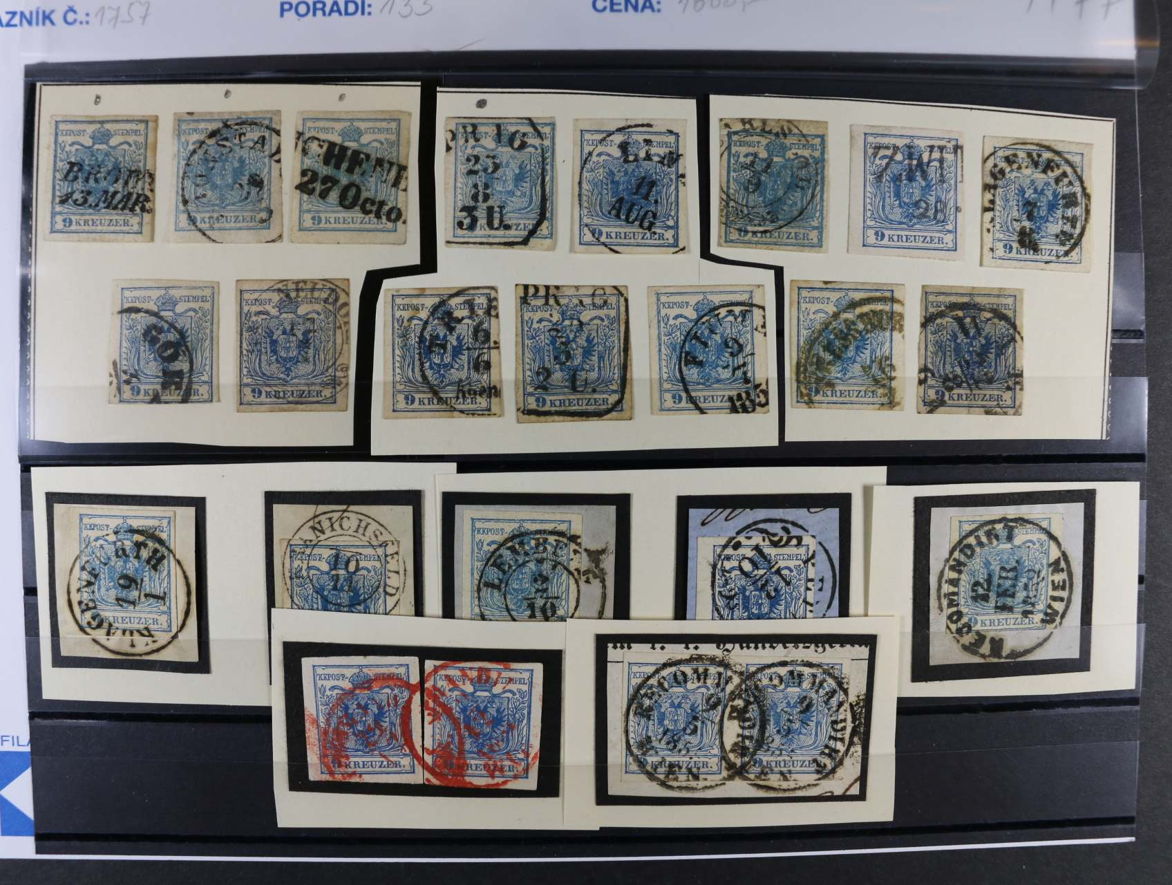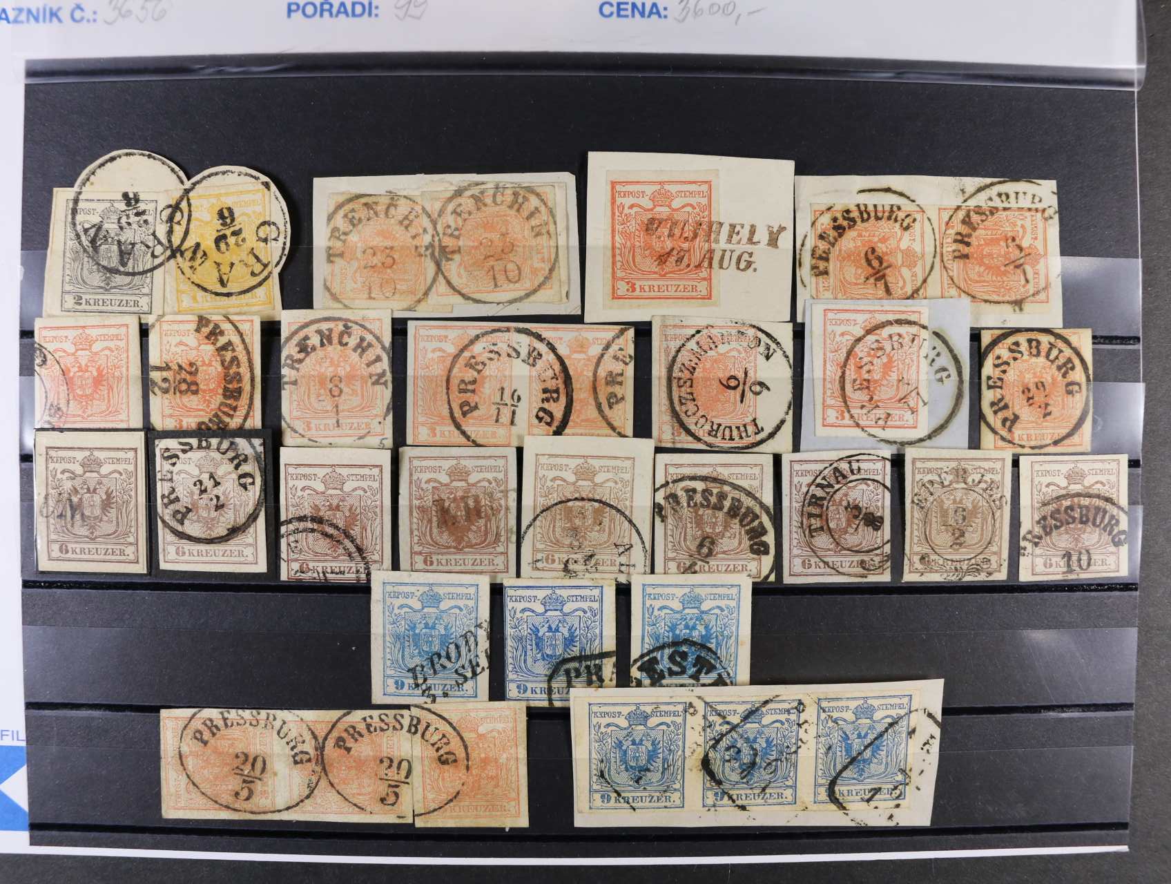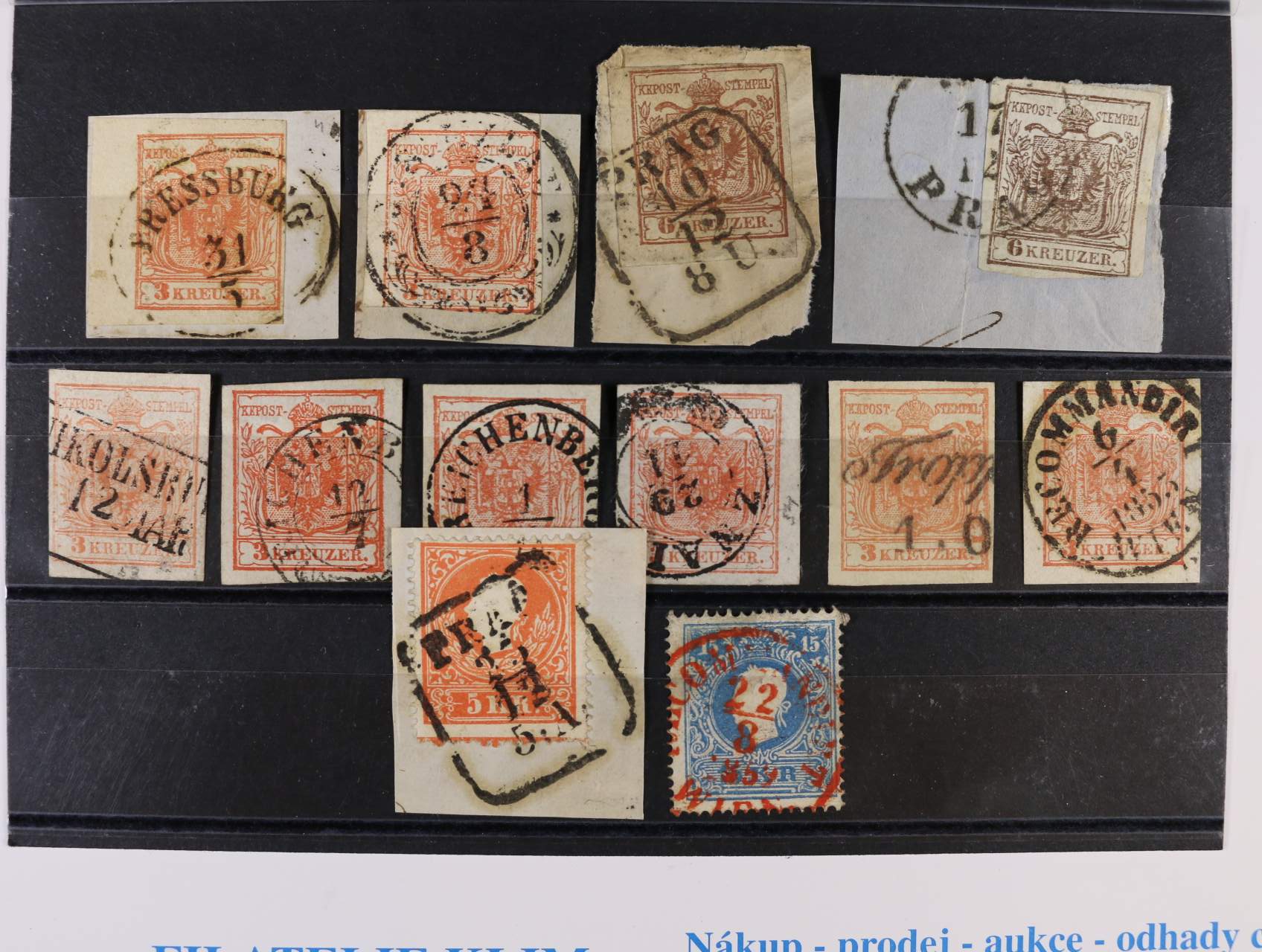 sestava 5 výstřižků a 6 ks zn. z I. a II. emise, mj. výstřižek se zn. Fe. č. 3 s levým okrajem 6 mm, vys. kat. záznam