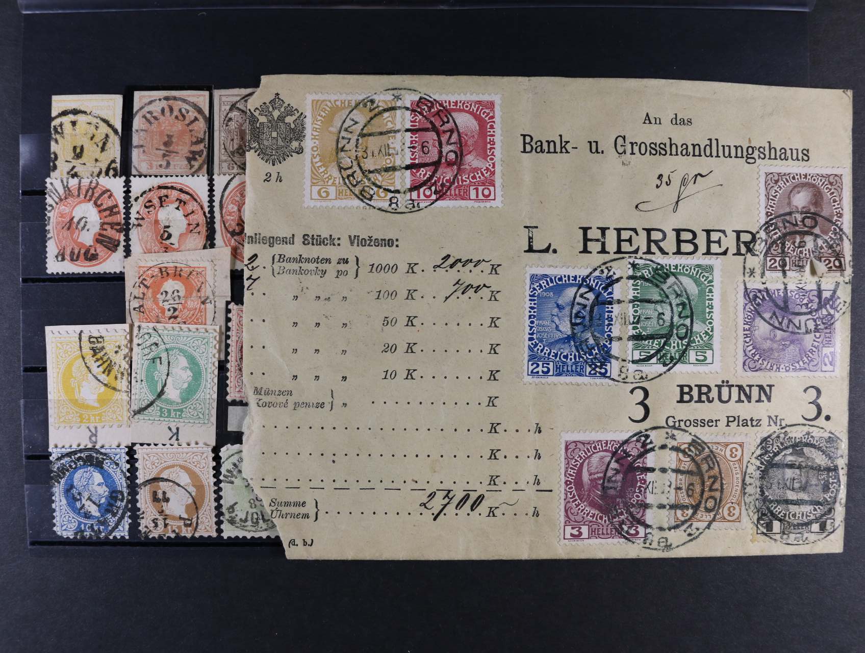 sestava 36 ks zn. a výstřižků I. VIII. emise, mj. zn. Fe. č. 1, zajímavá raz. + cenné psaní na 2700K se smíš. frankaturou emisí 1904 + 1905 + 1908, pestrá frankatura, na levé straně utržené rožky