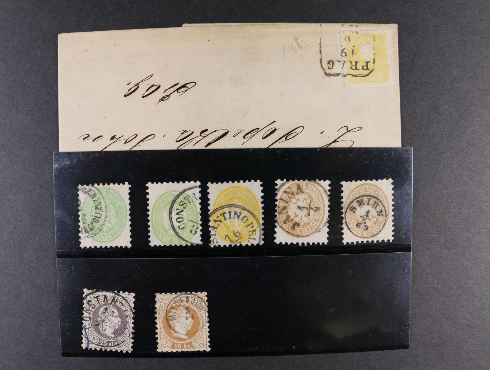 1486 sestava 10 ks známek Rakouska a Lombardska z II. - VI. emise + tři dopisy, z toho dva frank. zn. Fe. č. 10 II, resp. 12 II, zajímavá raz. 2500