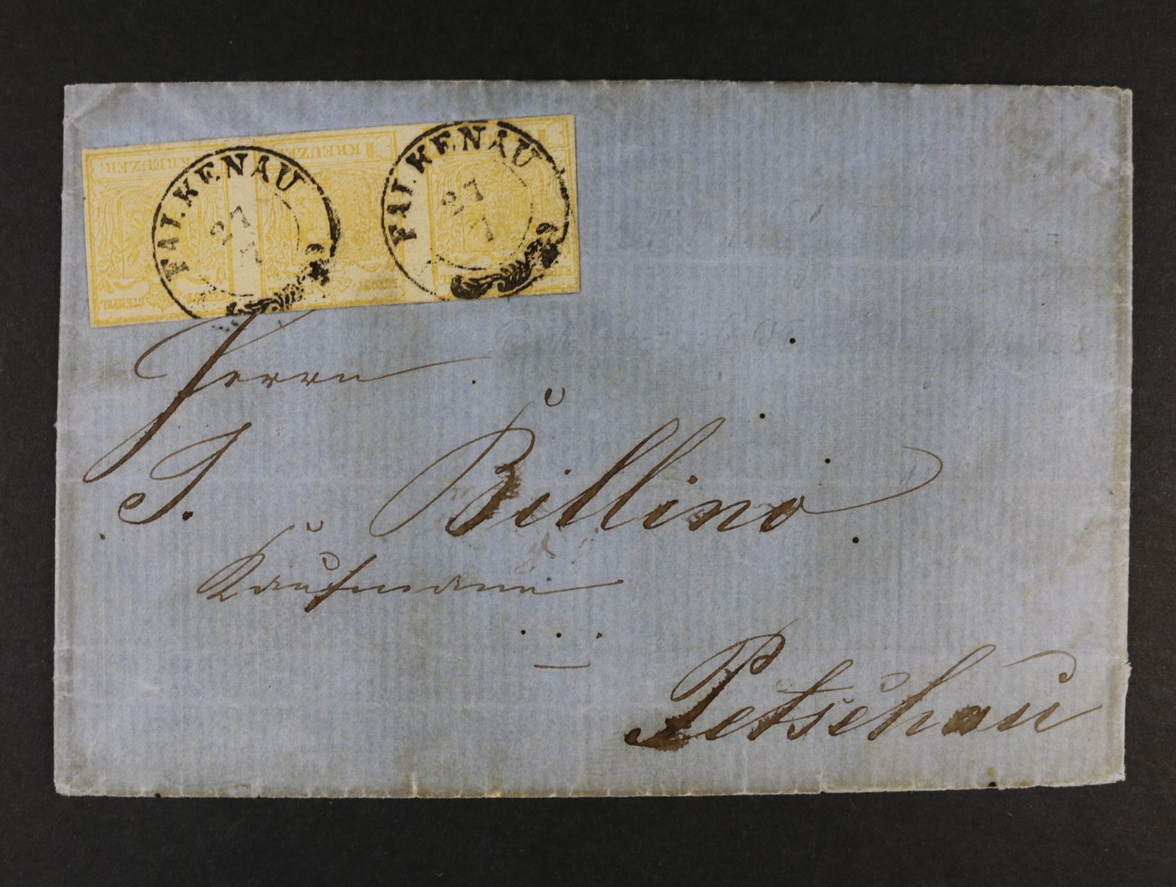 1491 skl. dopis z r. 1859 do Petschau frank. třípáskou zn. Fe. č. 1 HP, typ Ia, pod. raz. FALKENAU 27.7. 9500