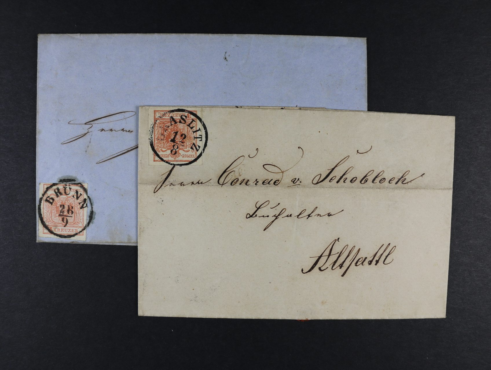 1495 skl. dopis z r. 1853 frank. zn. Fe. č. 3 HP, pod. raz. GRASLITZ 12.8. + přích. raz. a dtto z r. 1855 frank. zn. Fe. č. 3 HP, typ III, pod. raz. BRÜNN 28.9. + přích. raz. 300