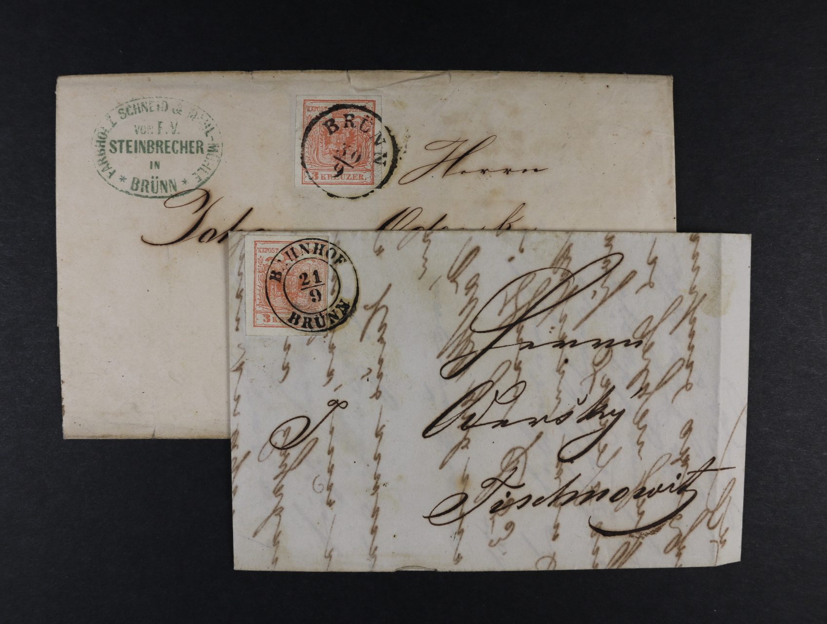1496 firemní skl. dopis z r. 1855 frank. zn. Fe. č. 3 HP, typ III, pod. raz. BRÜNN 30.9., firemní a p řích. raz. a skl. dopis z r. 1855 frank. zn. Fe. č. 3 MP, typ III, s raz. BAHNHOF BRÜNN 21.9. + průch. a přích. raz. 400