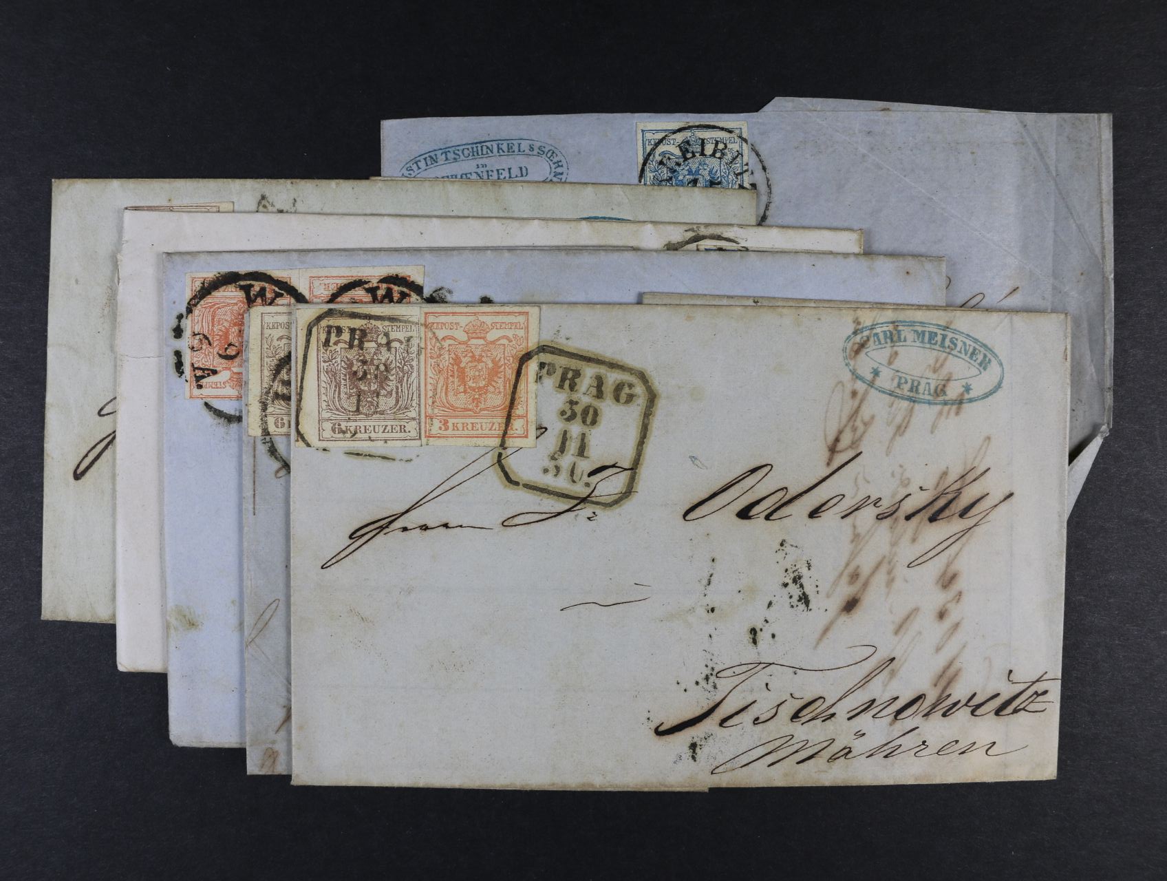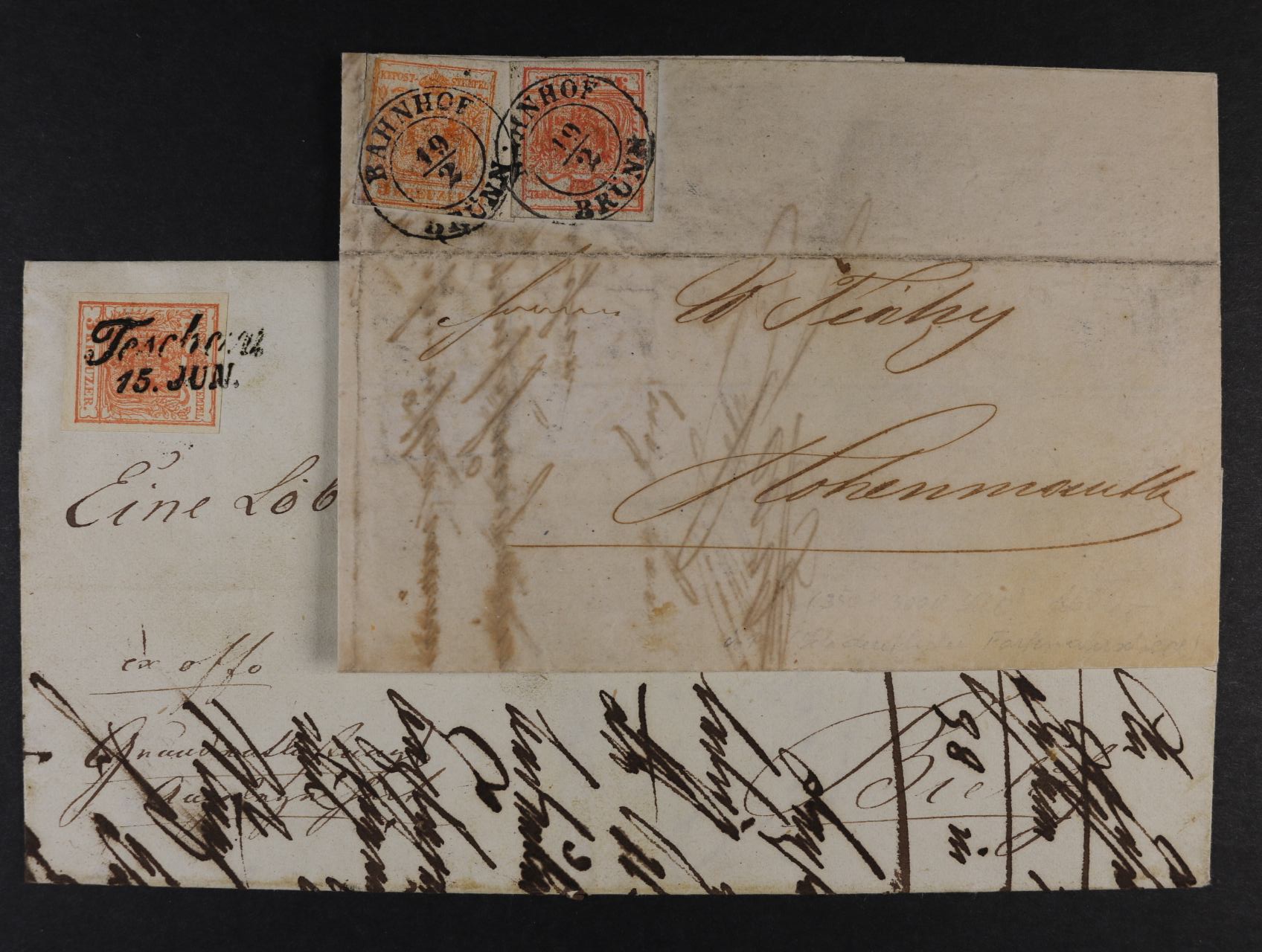 1498 služ. skl. dopis do Bielitz z r. 1853 frank. zn. Fe. č. 3 HP, typ I, lux. střih, řádkové raz. TESCHEN 15.JUN. a skl. firemní dopis z r. 1857 do Vysokého Mýta frank. zn. Fe. č. 3 (2x - různé bar. odstíny), luxus. střih, pod. raz. BAHNHOF BRÜNN 19.2. 900