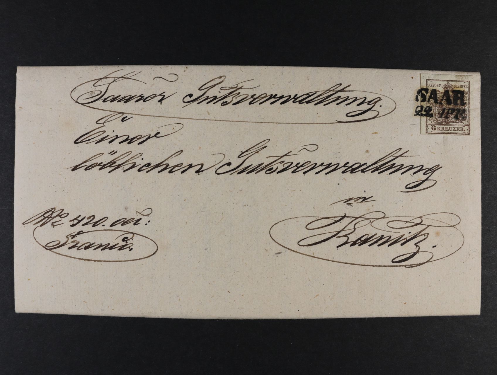 1500 skl. dopis z r. 1854 frank. zn. Fe. č. 4 s řádkovým raz. SAAR (Žďár) 22.APR., neporušená suchá pečeť, přích. raz. BRÜNN, dekorativní 500