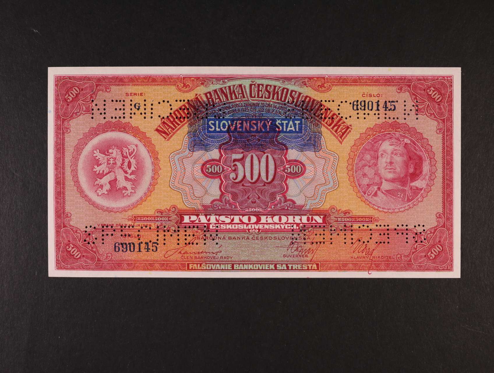 1995 500 Ks 2.5.1929 s přetiskem série G, bankovní vzor s 4x vodorovnou perf. SPECIMEN, Ba. 44, Pi. 2s, Kar. 40c 10000