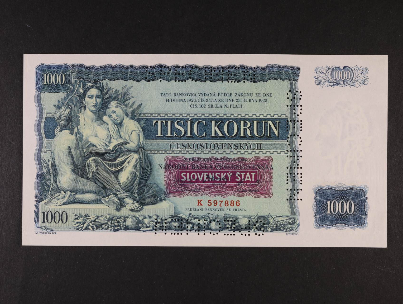 1997 1000 Ks 25.5.1934 s přetiskem série K, bankovní vzor s 3x perf. SPECIMEN, Ba. 45, Pi. 3a, Kar. 41 20000