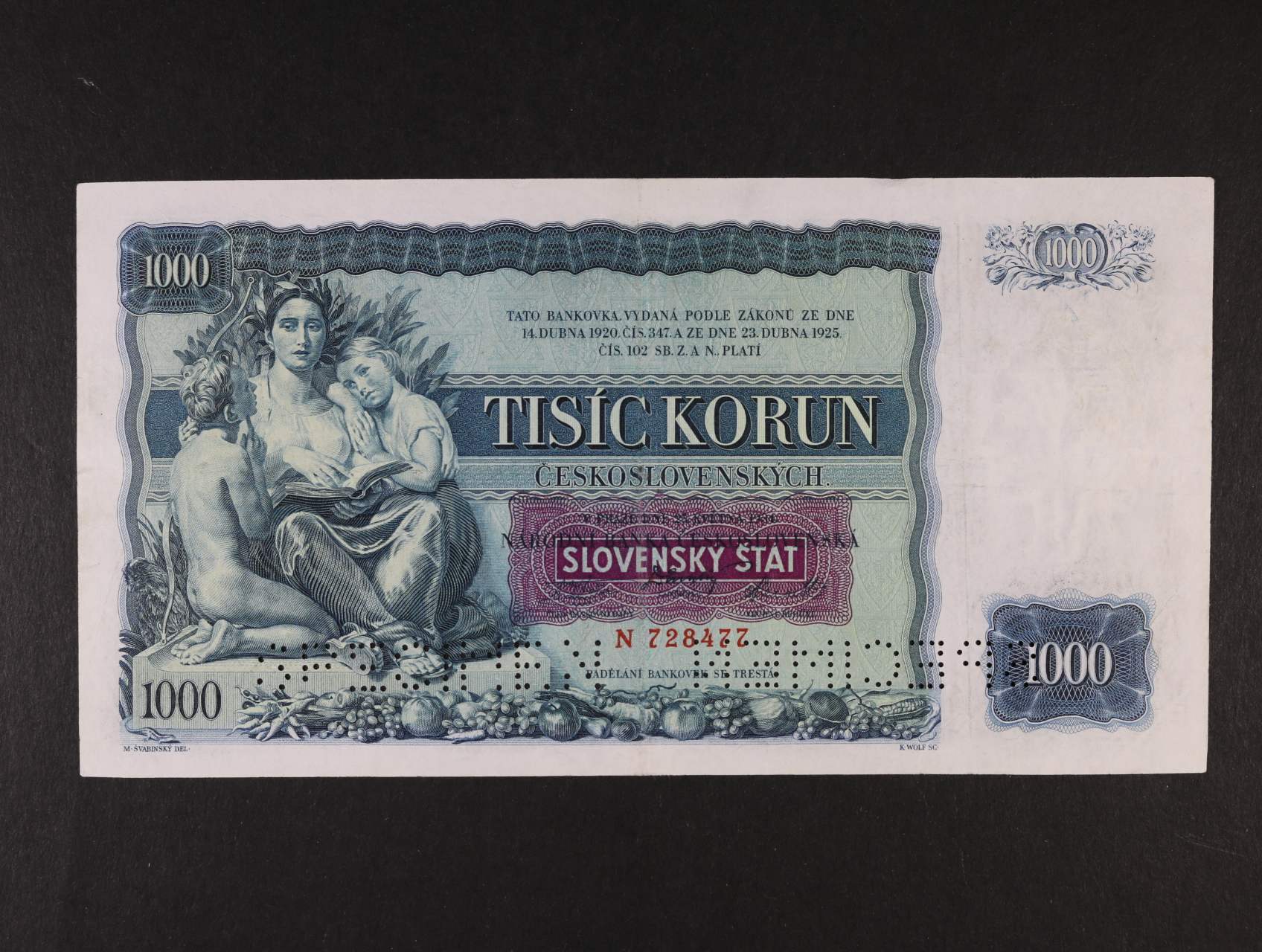 1999 1000 Ks 25.5.1934 s přetiskem série A, 2x perf. SPECIMEN, Ba. 45, Pi. 3s 4500