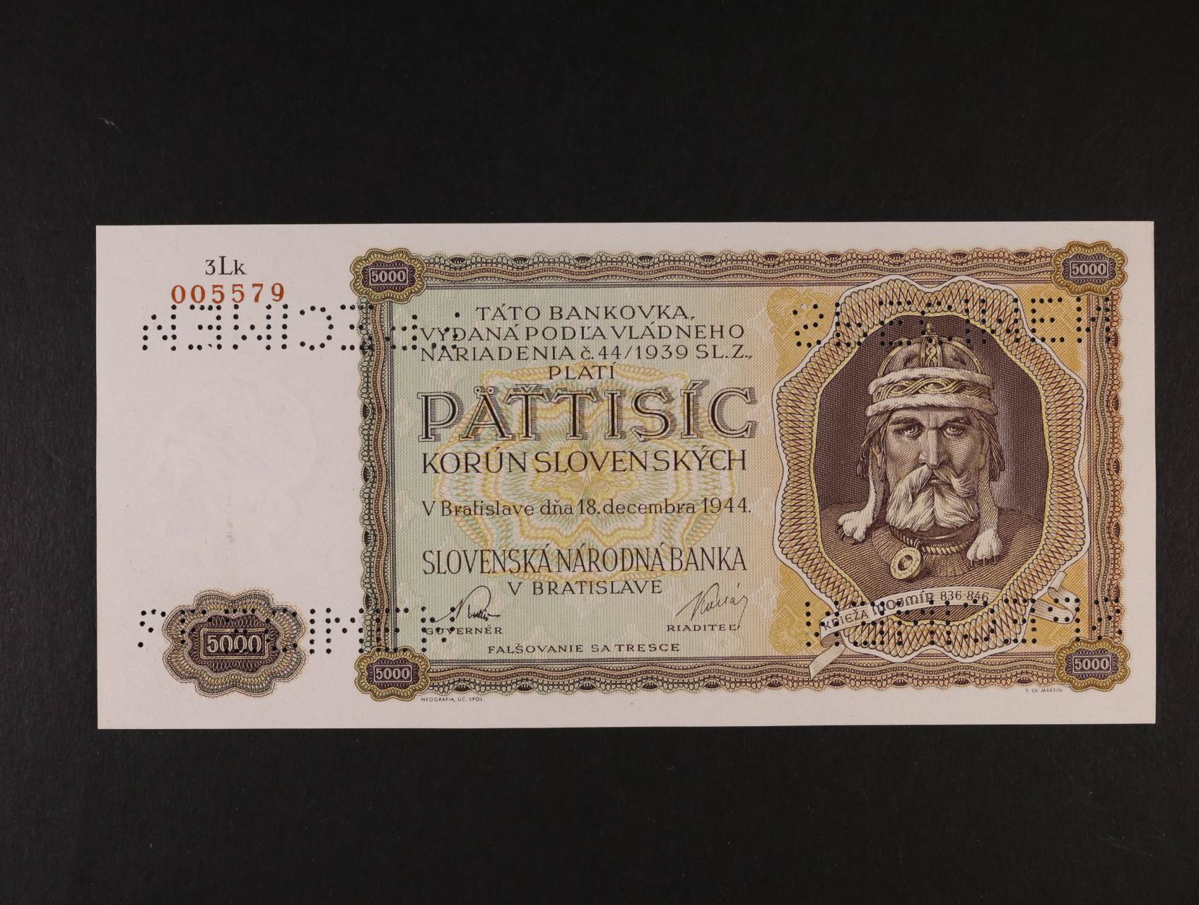 2018 5000 Ks 18.12.1944 série 3Lk, nevydaná, bankovní vzor s 4x perf. SPECIMEN, Ba. N5, Pi. 14a, Kar. 52 2500
