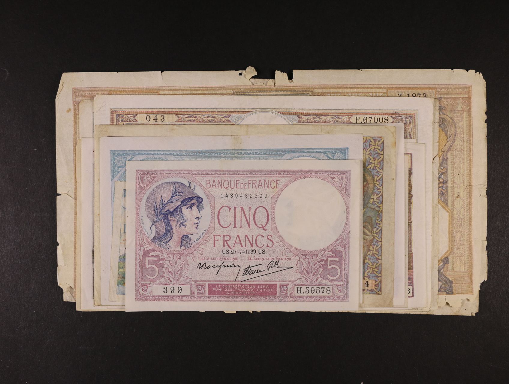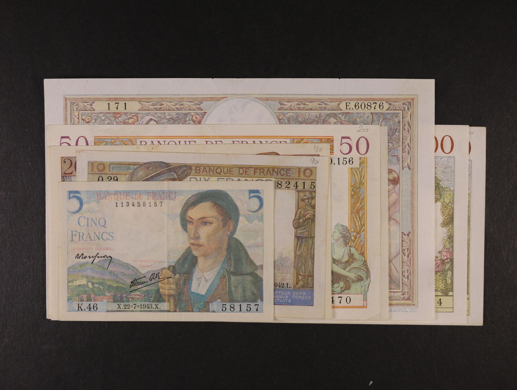5 Fr 1939, 1943, 10 Fr 1941, 1943, 20 Fr 1940, 1941, 1943, 50 Fr 1941 (2x), 100 Fr 1939, 1940, 1942, 500 Fr 1941, 1000 Fr 1932, 1943, 5000 Fe 1941, 10 Fr a 50 Fr pro okupované území, nouzovky Paris, Roubaix, Alžír 5 Fr 1927, zajímavá partie, 21ks