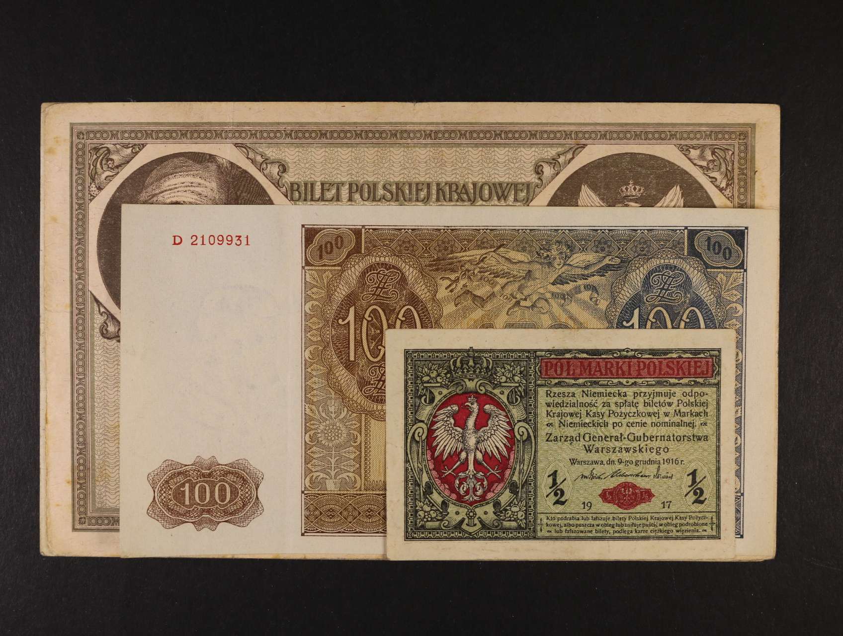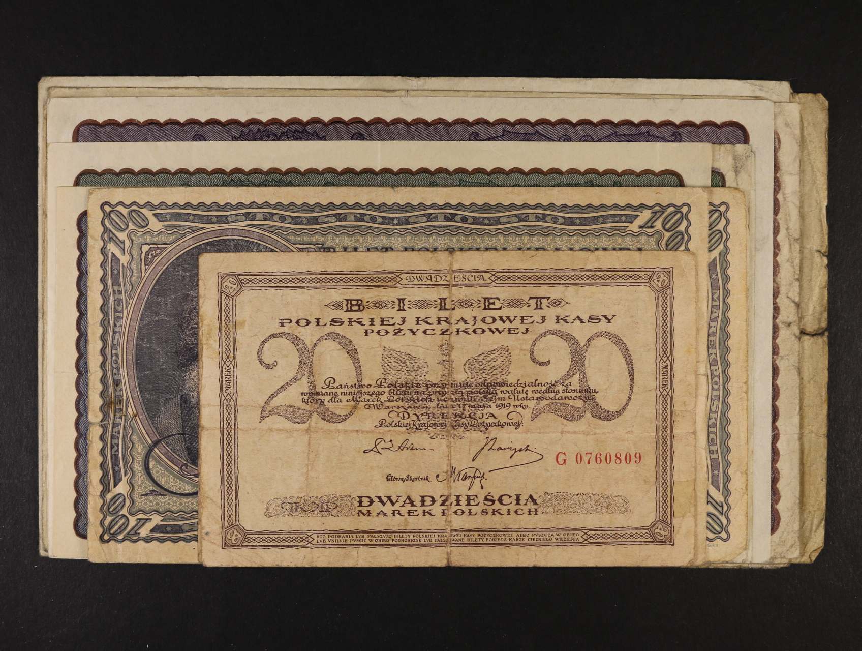 2404 1/2 Marek 1917 série B, 1000 Marek 17.5.1919 sér. E, III sér. E, 100 Zlotych 1.8.1941, Pi. 7, 22 (2x), 103 300