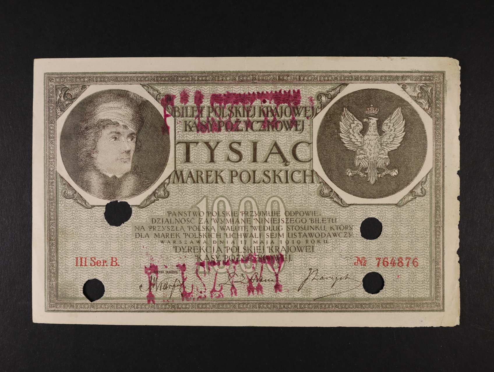 2405 padělek, 1000 Marek 17.5.1919 s 2x raz. FALSZYWY a 4x se skartačním otvorem, Pi. 22 500