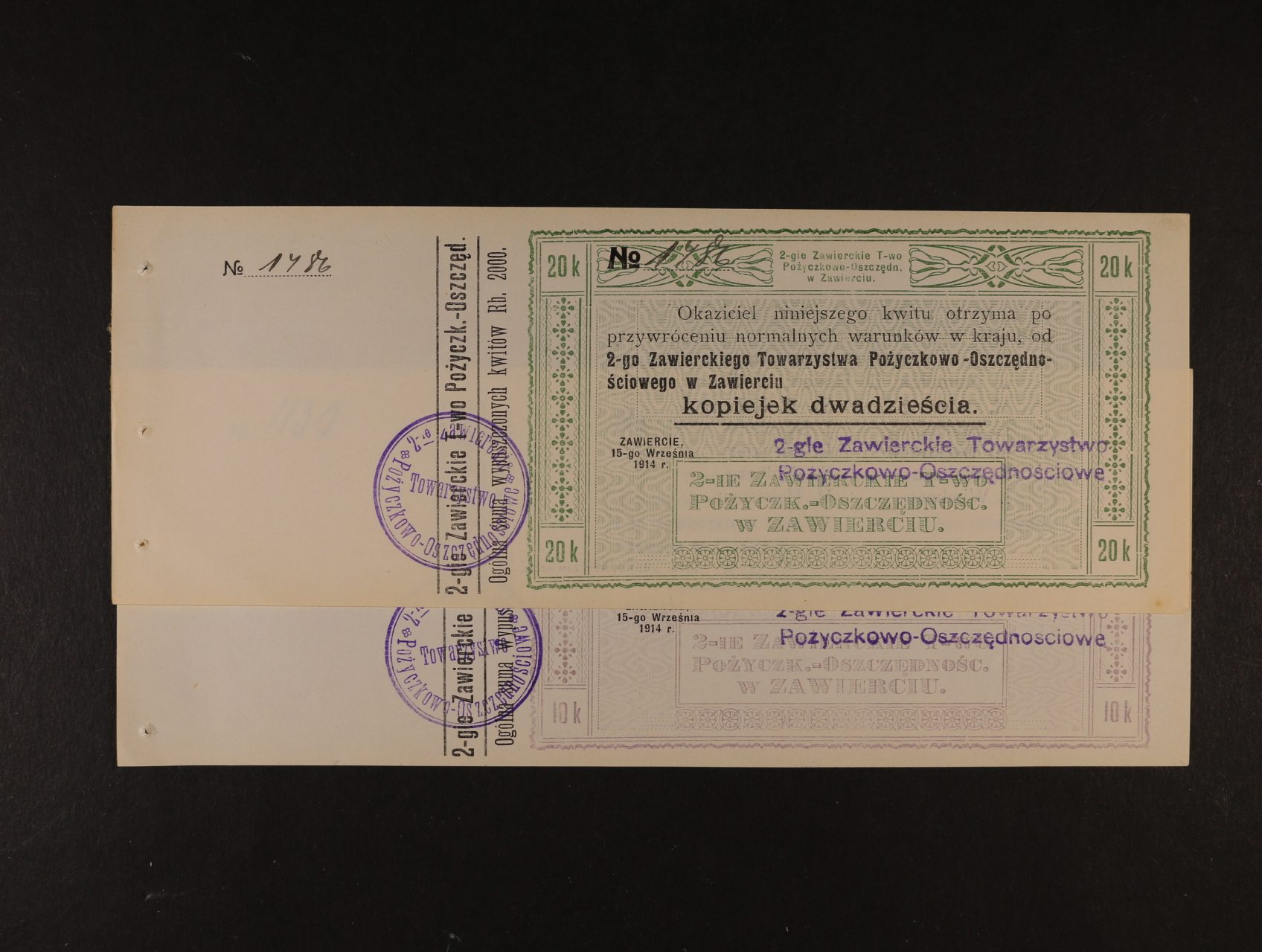 2411 Zawiercie, 10, 20 Kopiejek 15.9.1914, Pod. 498 1100