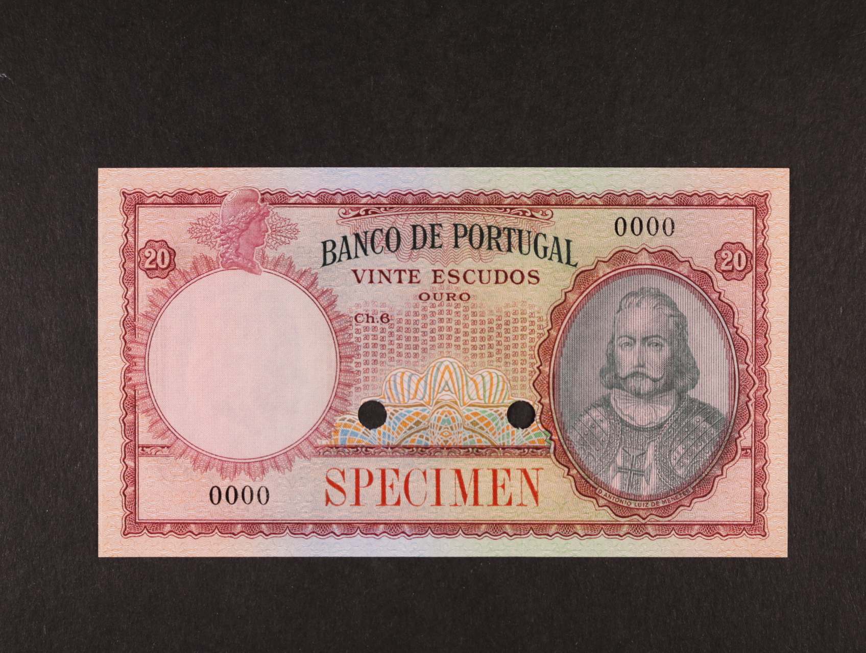 2414 20 Escudos 1941 anulát s přetiskem SPECIMEN, perf. otvory, sez data a podpisu, tisk v červené barvě, Pi. 153 15000