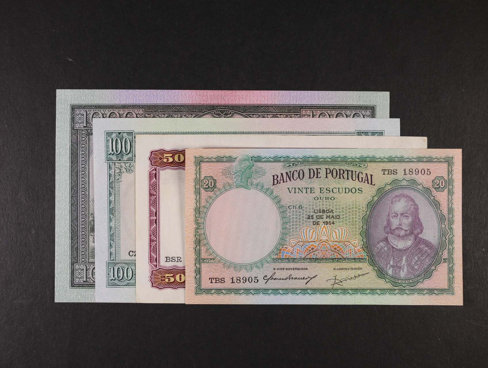 2415 20 Escudos 25.5.1954, 50 Escudos 31.10.1944, 100 Escudos 22.6.1954, 1000 Escudos 29.9.1942, Pi. 153a, 154, 156, 159 1500