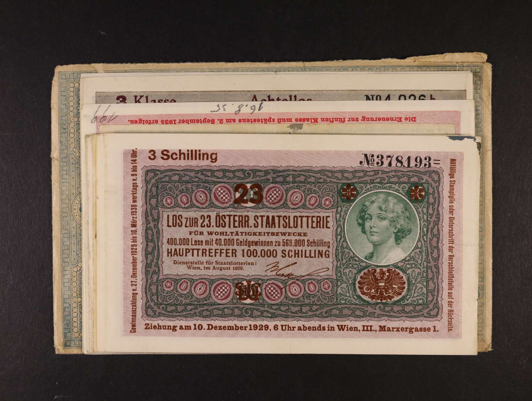 2420 Donaustaat, 10 (13 ks), 20, 50 (2 ks), 100 (10 ks) vše s různými přetisky Staatslotterie, celkem 26 ks 800