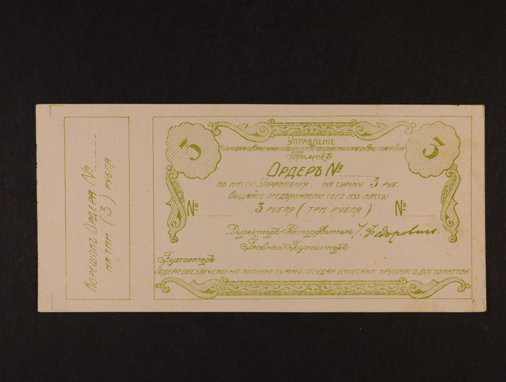 2494 Tomsk. Upravlenija Kuzneck. Kamenougoln. Metalurg. A.O., 3 Rubel 1921, Kard. 248.56 1100