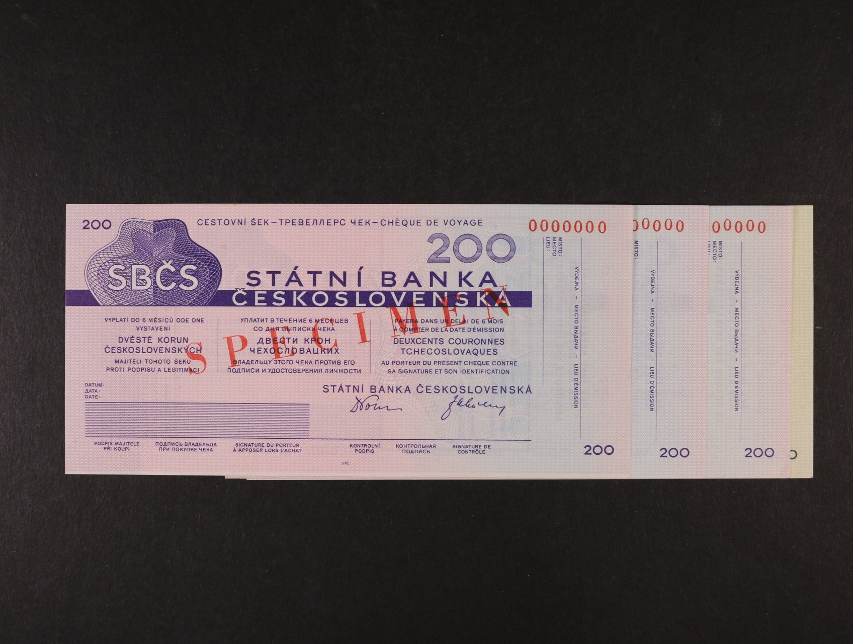 cestovní šeky SBČS 200 Kčs (3x), 500 Kčs z let 1980, anuláty s přetiskem SPECIMEN, celkem 4ks