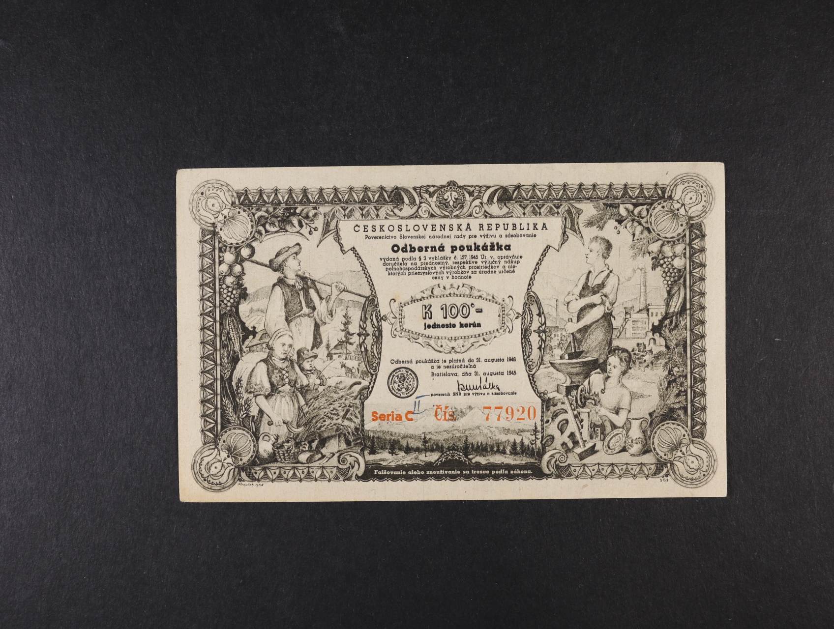 ČSR, odberná poukážka - Poverenictvo Slovenskej národnej rady pro výživu a zásobovanie - 100 K 31.8.1945