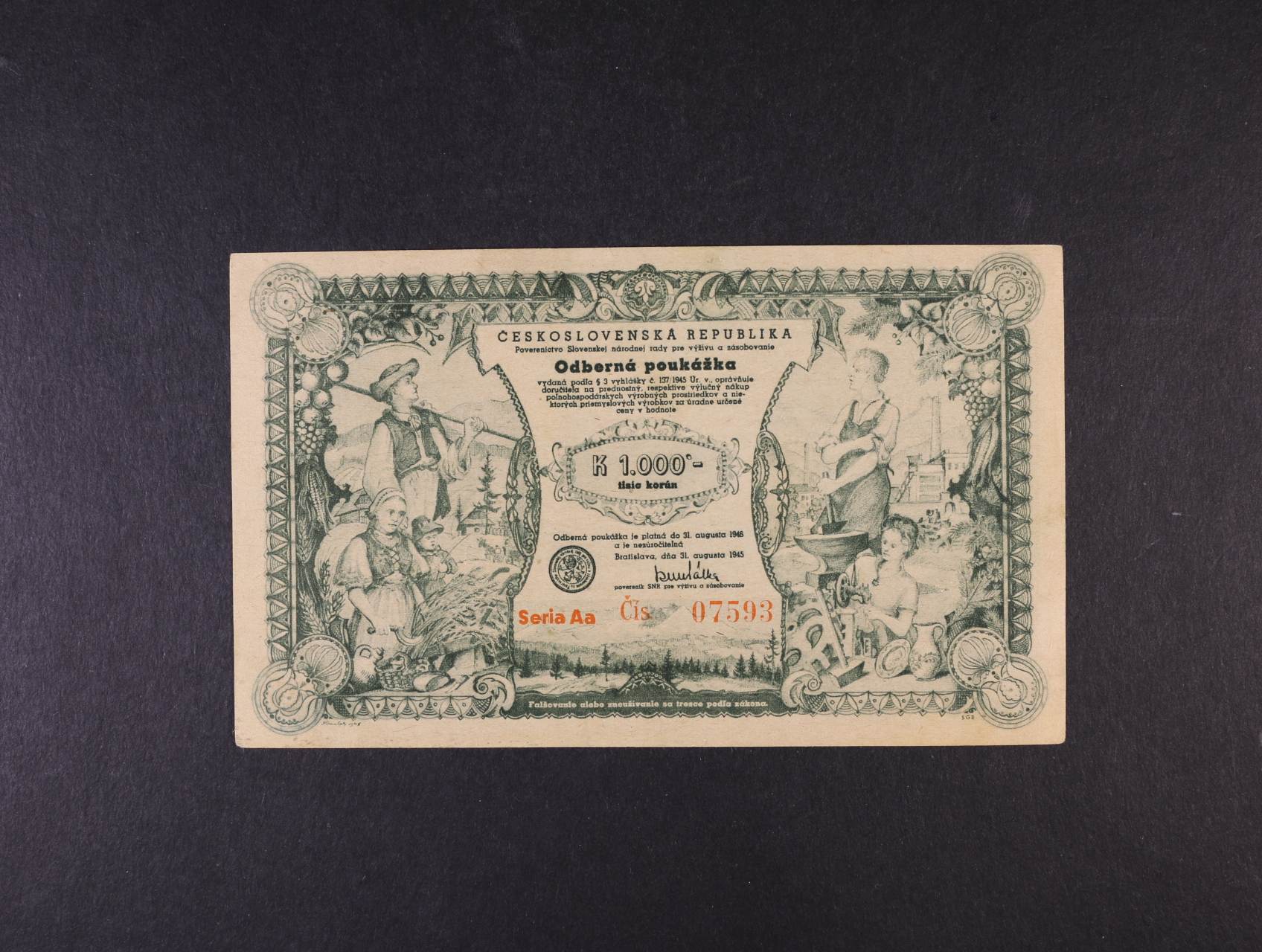 ČSR, odberná poukážka - Poverenictvo Slovenskej národnej rady pro výživu a zásobovanie - 500 K 31.8.1945